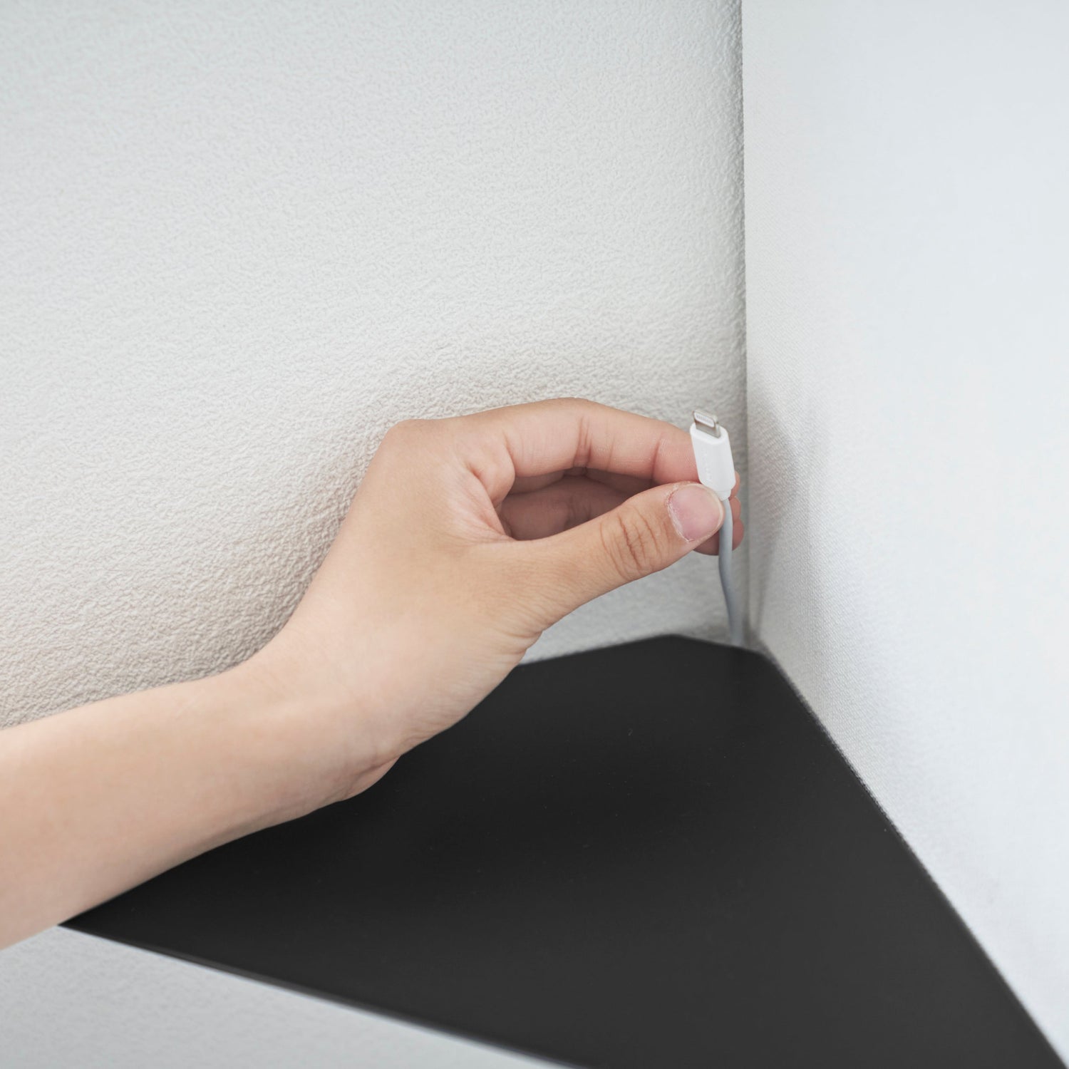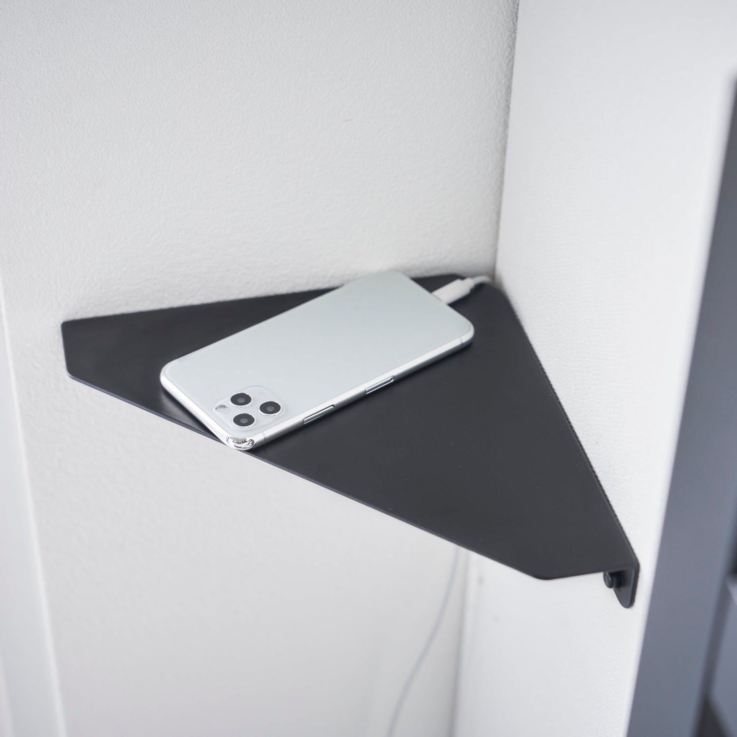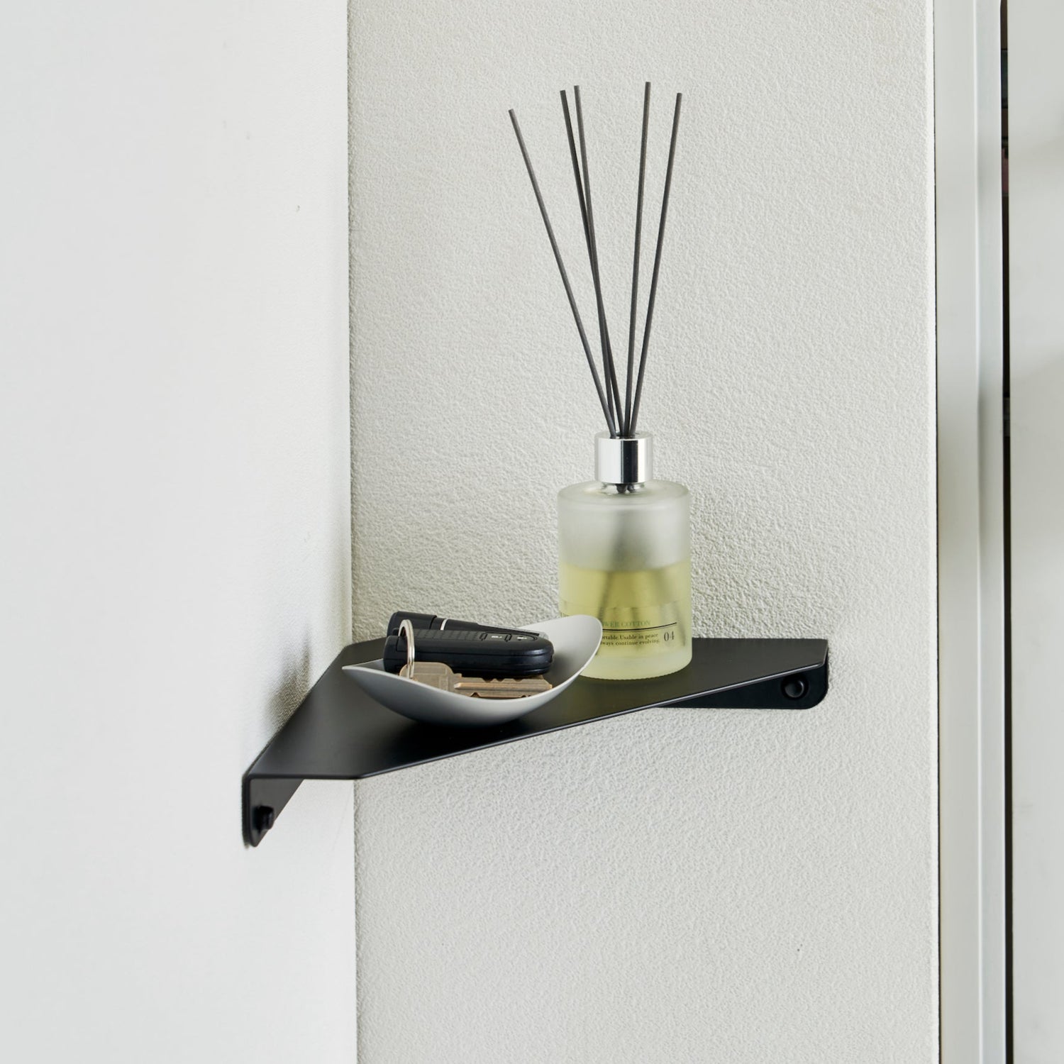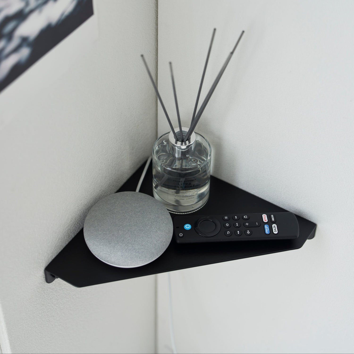En sort hjørnehylle som utnytter veggplassen optimalt. Det minimalistiske designet gir en praktisk oppbevaringsløsning for små gjenstander som bøker, klokker, briller eller dekor.