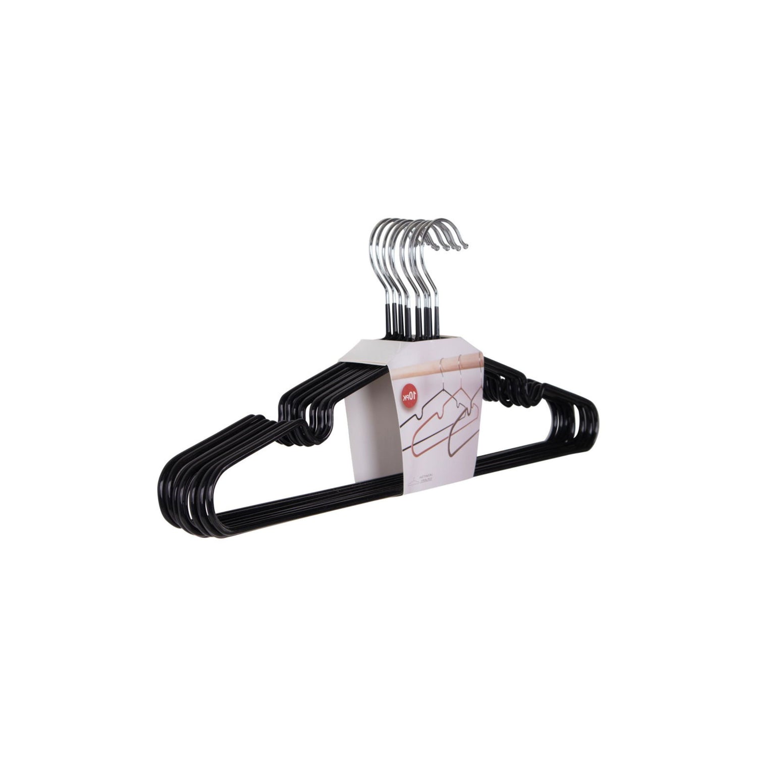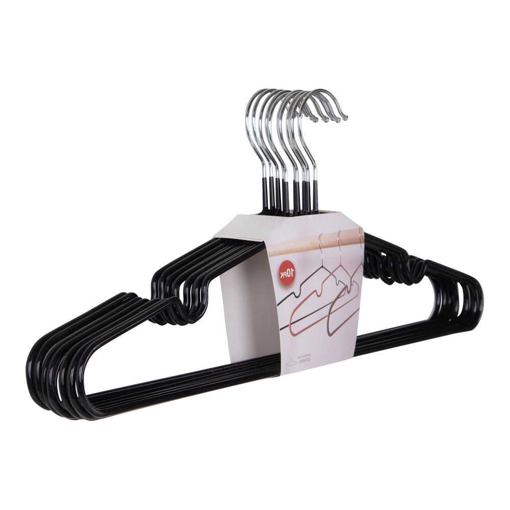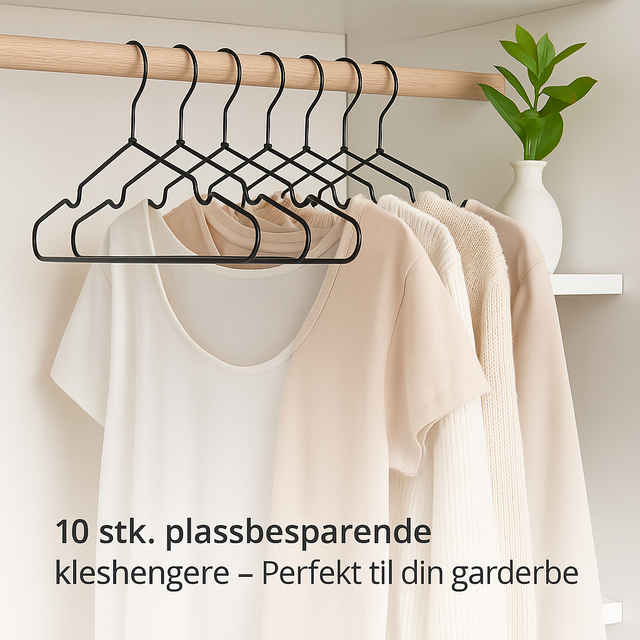 Den robuste konstruksjonen sikrer lang levetid, samtidig som den slanke formen sparer plass i garderoben. Settet inneholder 10 kleshengere, noe som gjør det til en praktisk løsning for en organisert garderobe. Den sølvfargede kroken roterer for enkel bruk og fleksibilitet i oppheng. En funksjonell og stilfull tillegg til ethvert klesskap.