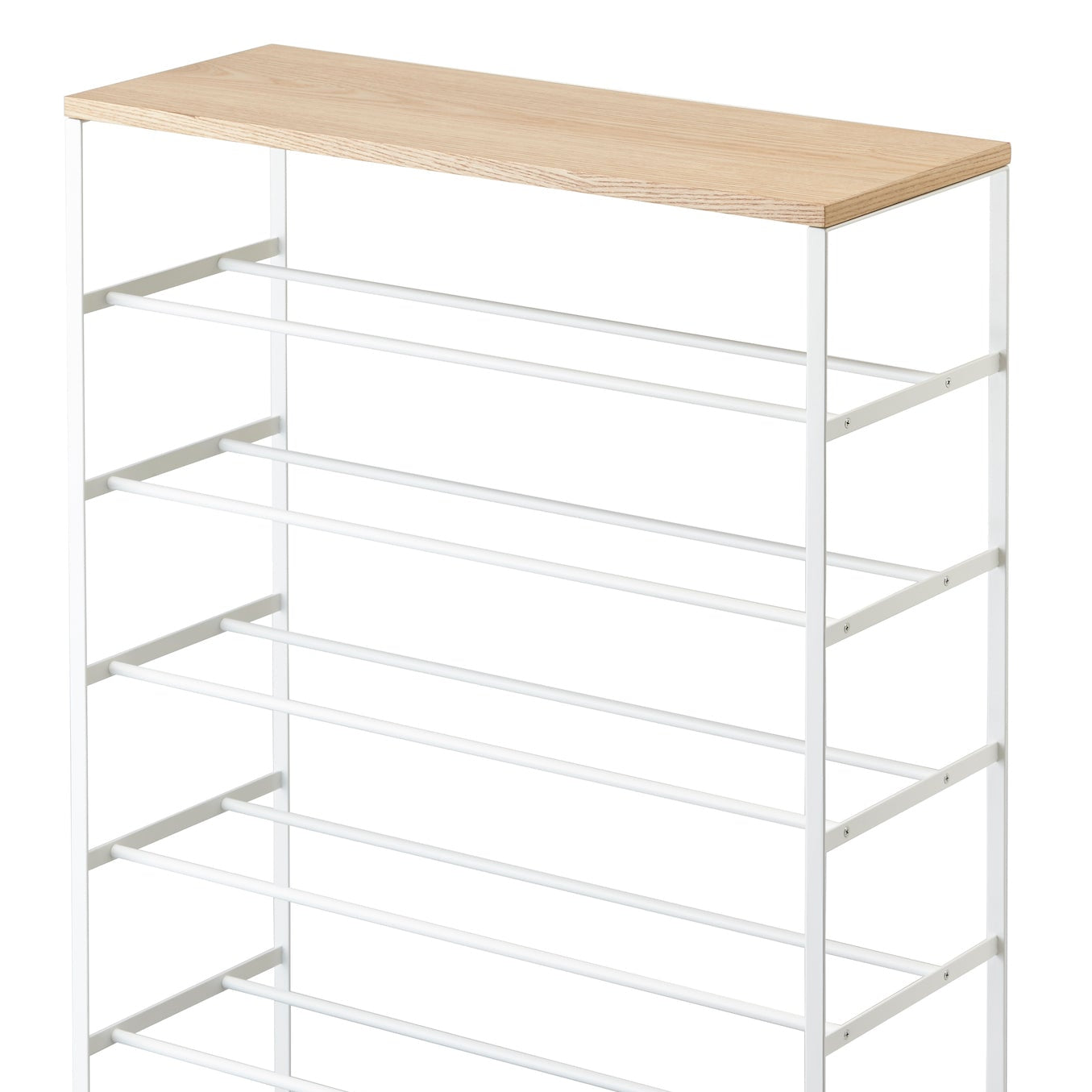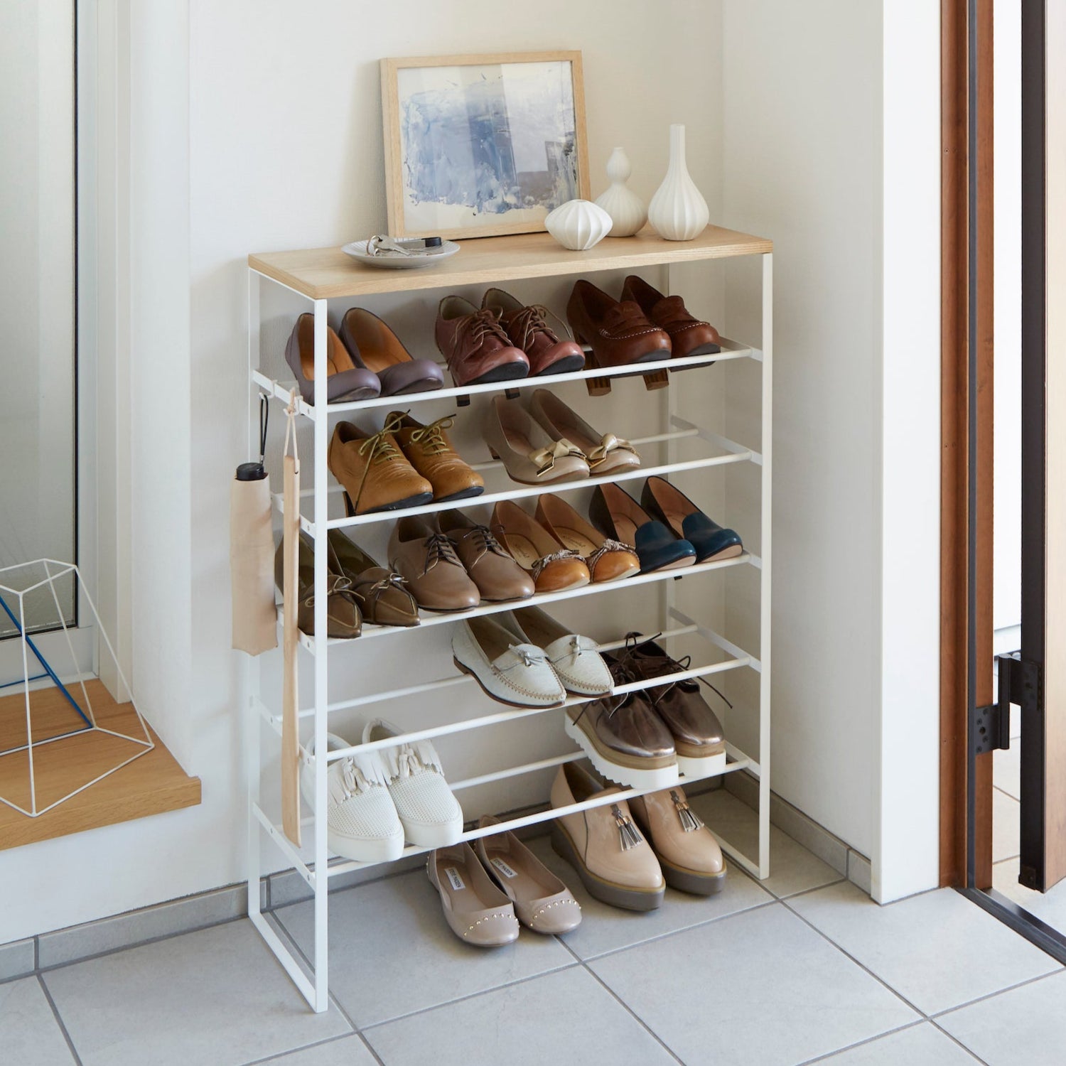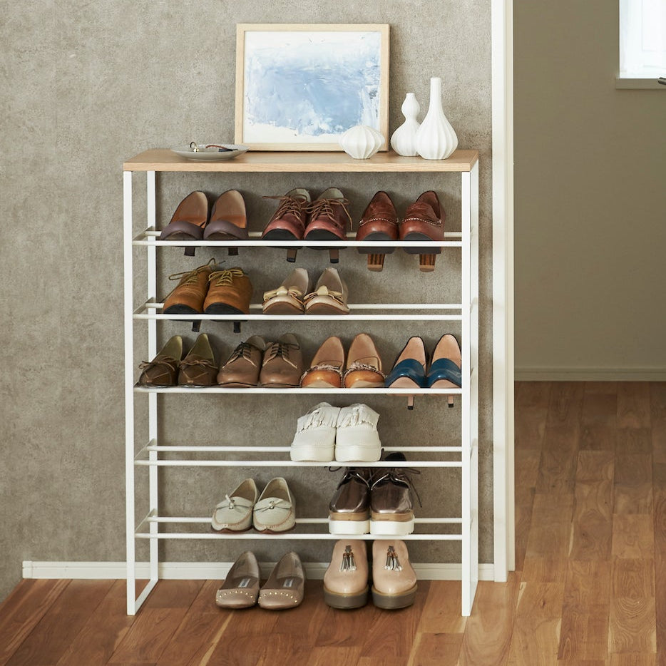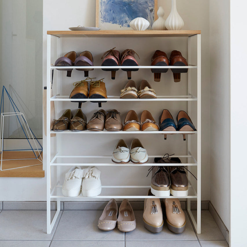 Dette elegante skostativet i hvitt kombinerer funksjonalitet med stilrent design. Med seks hyller gir det rikelig med plass til å organisere skoene dine, samtidig som den robuste metallrammen sikrer stabilitet.