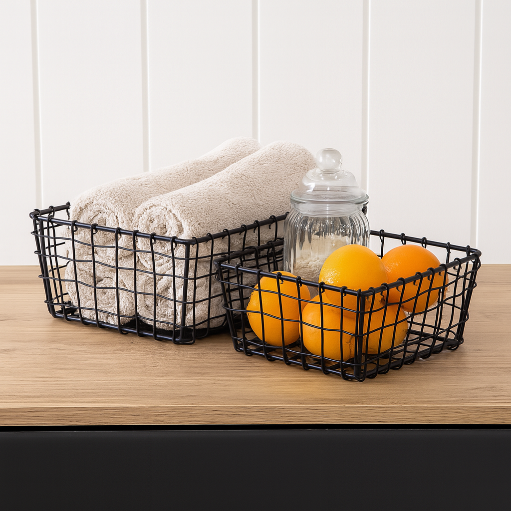 Dette settet med 2 trådkurver i sort metall er perfekt for deg som ønsker en moderne og funksjonell måte å organisere hjemmet på. Kurvene kommer i to ulike størrelser og passer like godt på badet, kjøkkenet og kontoret som i gangen, boden eller garderoben.
