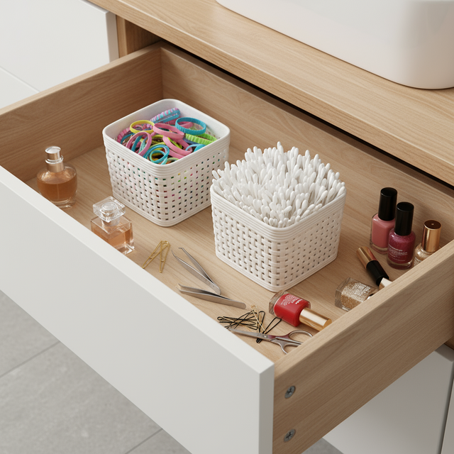 Små og dekorative oppbevaringskurver i sandfarget plast med flettet design. De er lette, solide og enkle å holde rene. Perfekt for deg som ønsker et ryddig og harmonisk uttrykk. Passer utmerket til oppbevaring av sminke, hårtilbehør, kontorartikler eller småting på badet og soverommet.