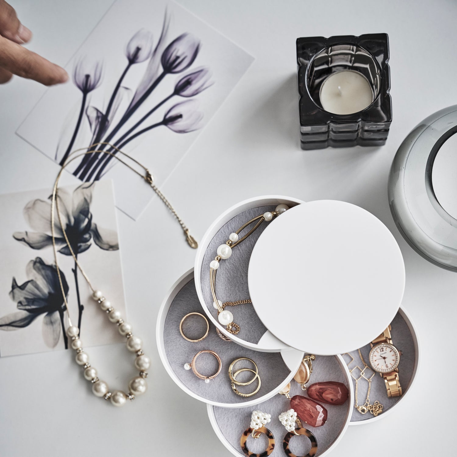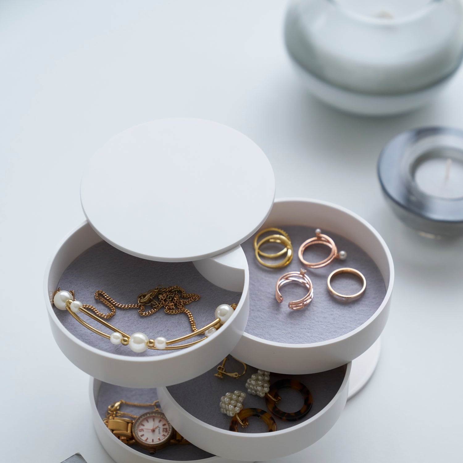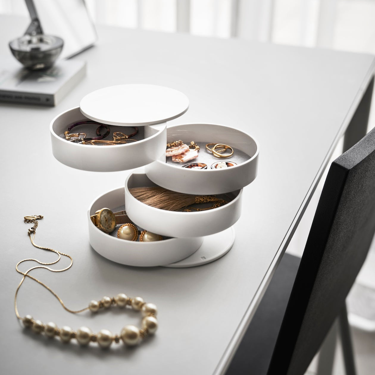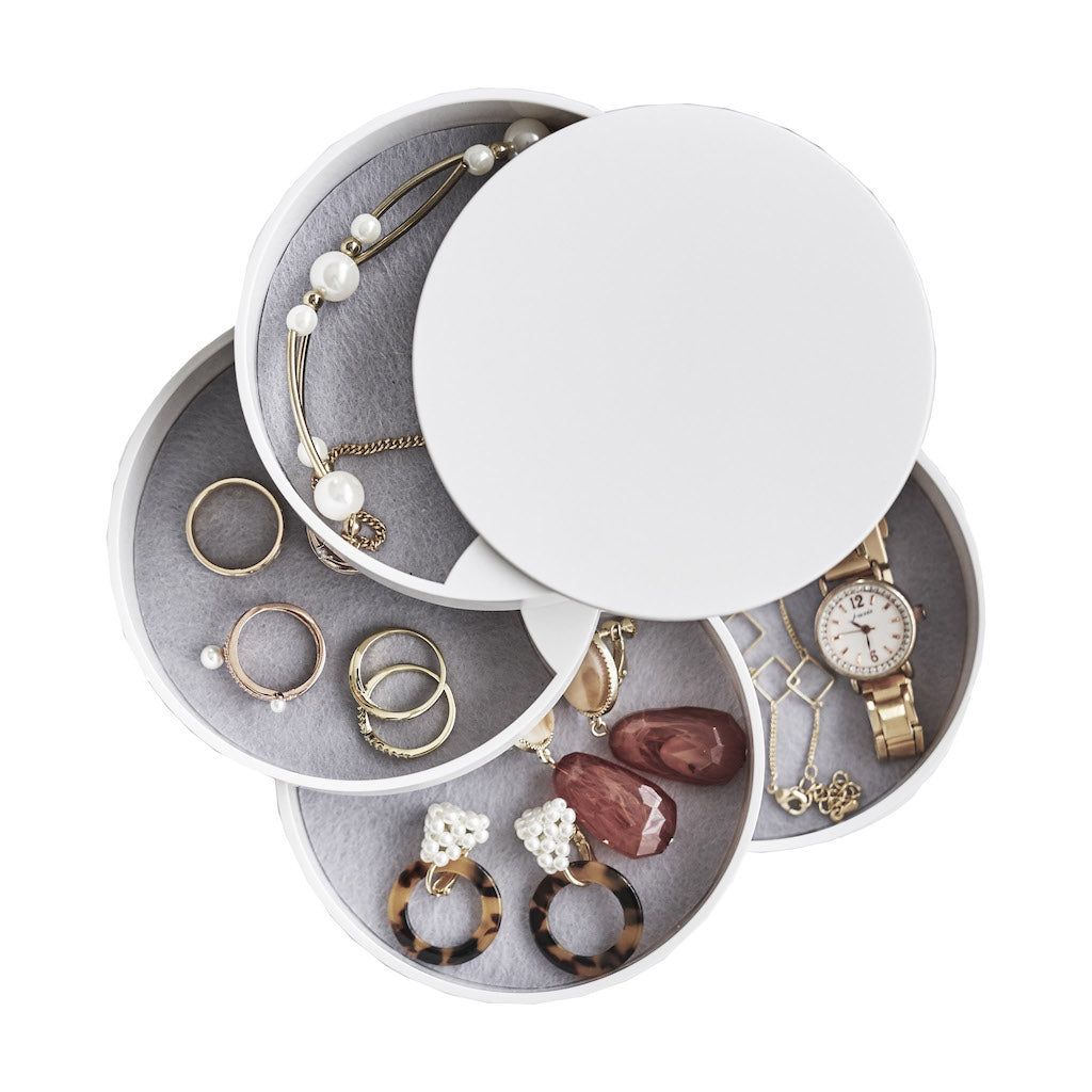 Den roterbare smykkeboksen i hvitt er en nydelig oppbevaringsløsning for smykker og små tilbehør.
