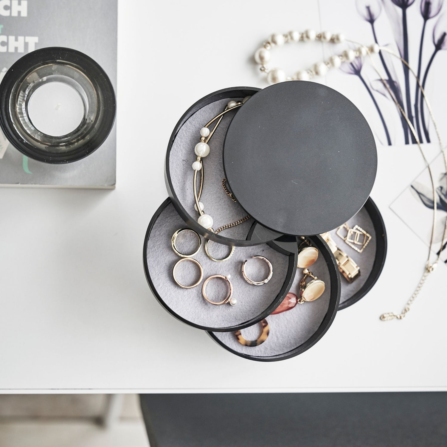 Den smarte, svingbare designen gir enkel oversikt over innholdet, samtidig som boksene tar minimalt med plass. Hver av de fire etasjene har mykt fôr for å beskytte smykker, ringer og tilbehør mot riper og slitasje.
