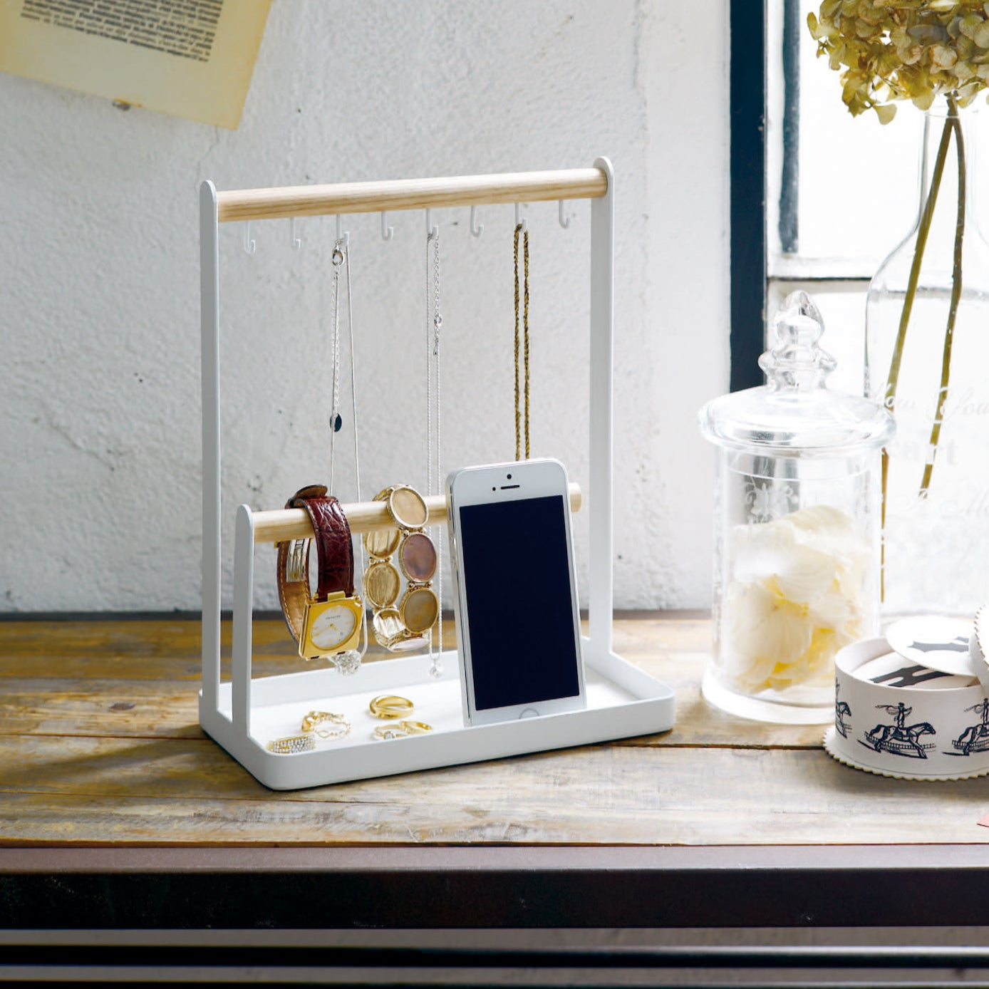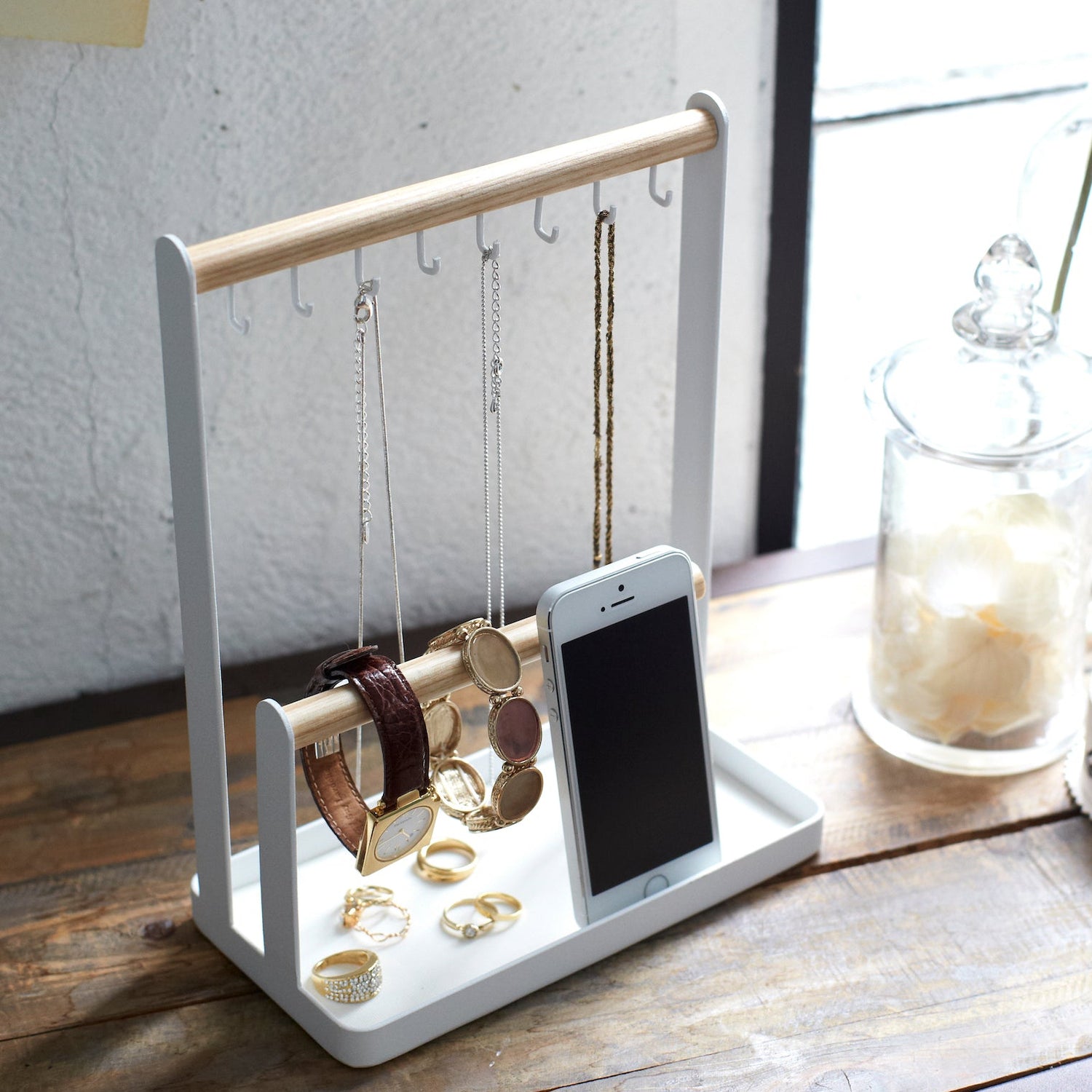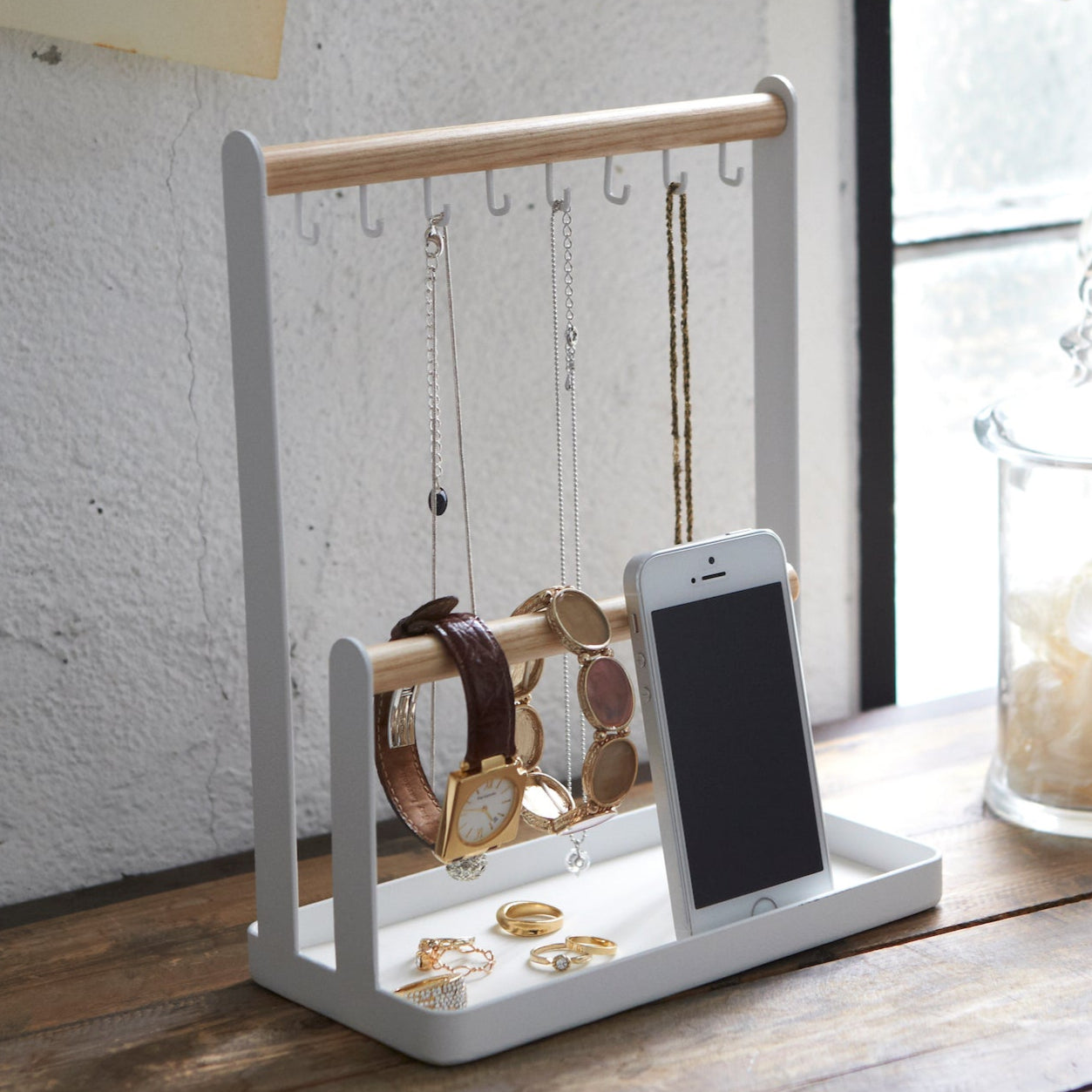 Stativet har kroker for kjeder og ringer, samt en tverrstang for armbånd og klokker. Bunnen fungerer som en oppbevaringsskål for mindre gjenstander eller en mobiltelefon.