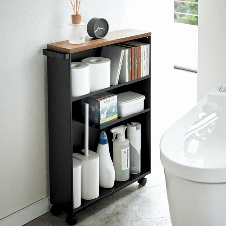 Sort toalettpapirstativ med skjult oppbevaring for ekstra doruller.