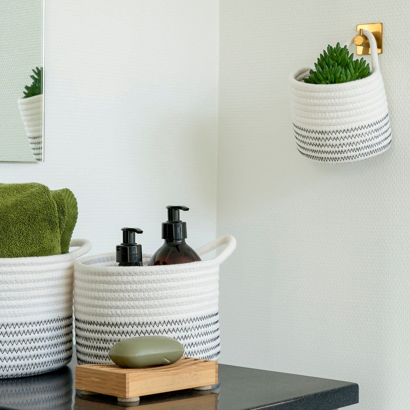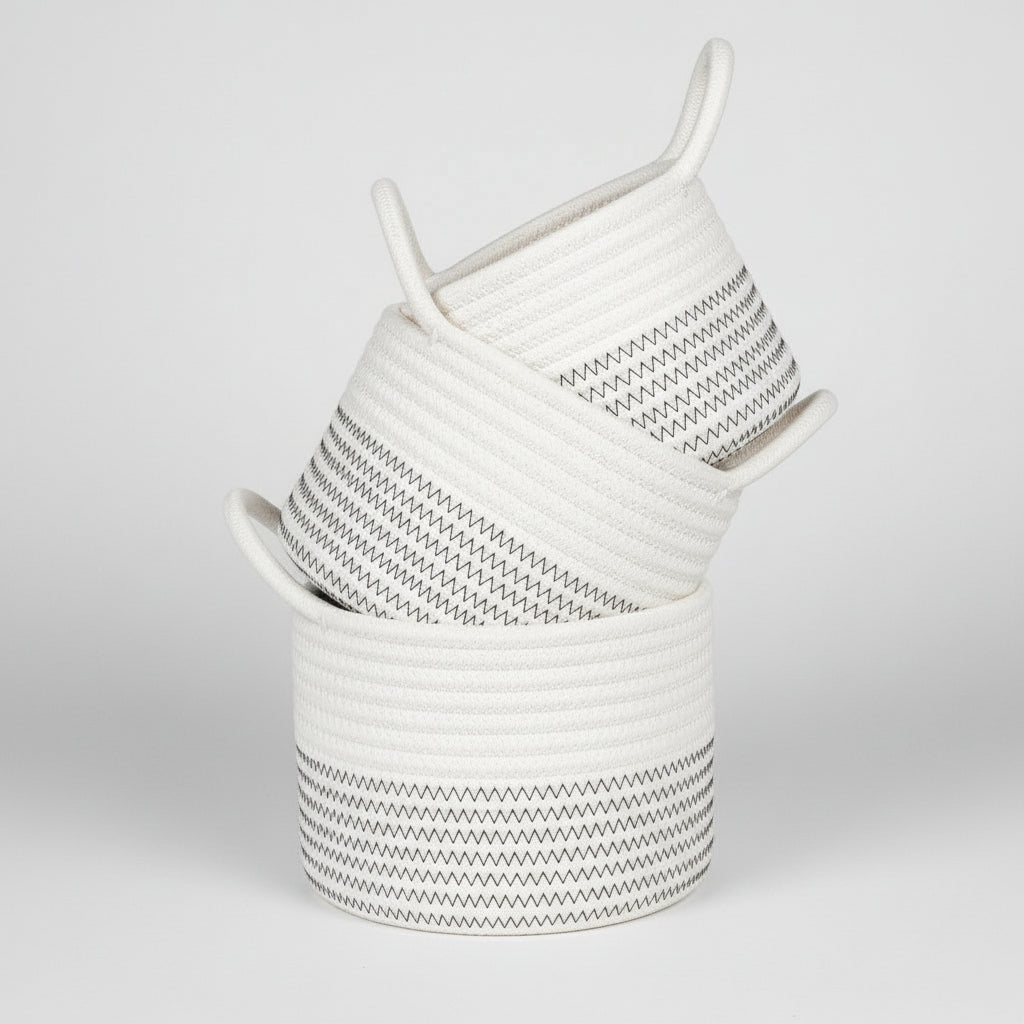 Oppbevaringskurver laget i myk bomull som holder formen sin over tid. De nøytrale fargetonene og det enkle designet passer perfekt i alle rom, enten du vil bruke dem til oppbevaring av småting på badet, barnerommet eller som dekor i stuen.