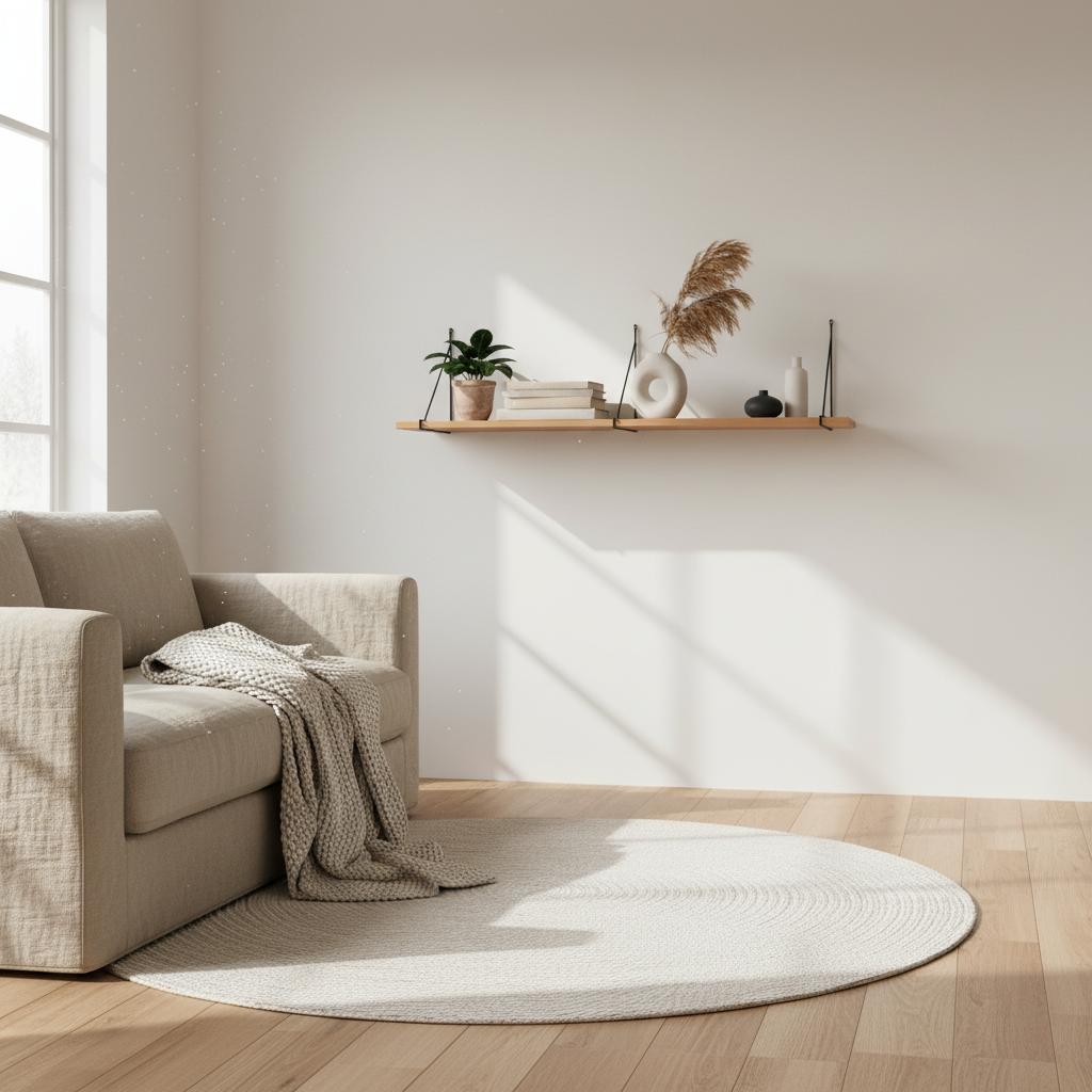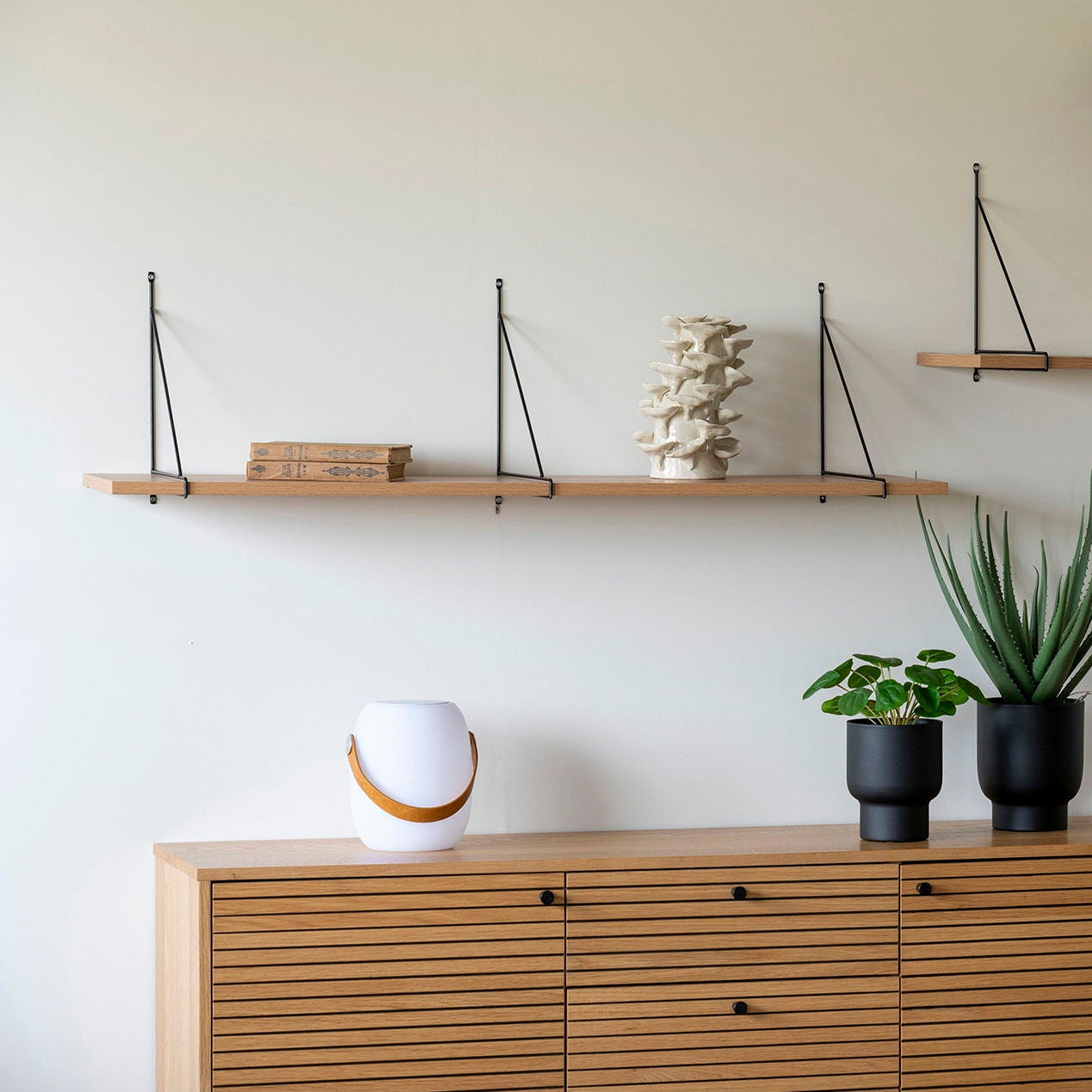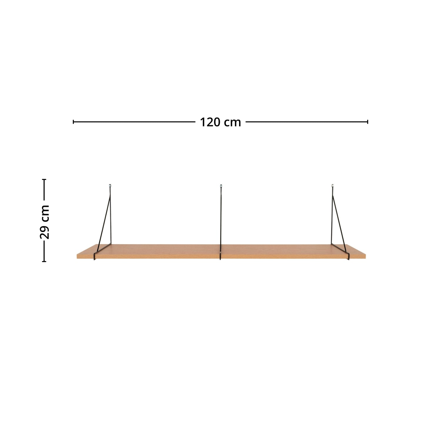 Med en bredde på 120 cm og dybde på 29 cm får du god plass til bøker, kunst, planter og dekor uten at hyllen virker tung. Den lange formen gjør den ideell over sofa, skjenk eller spisebord.