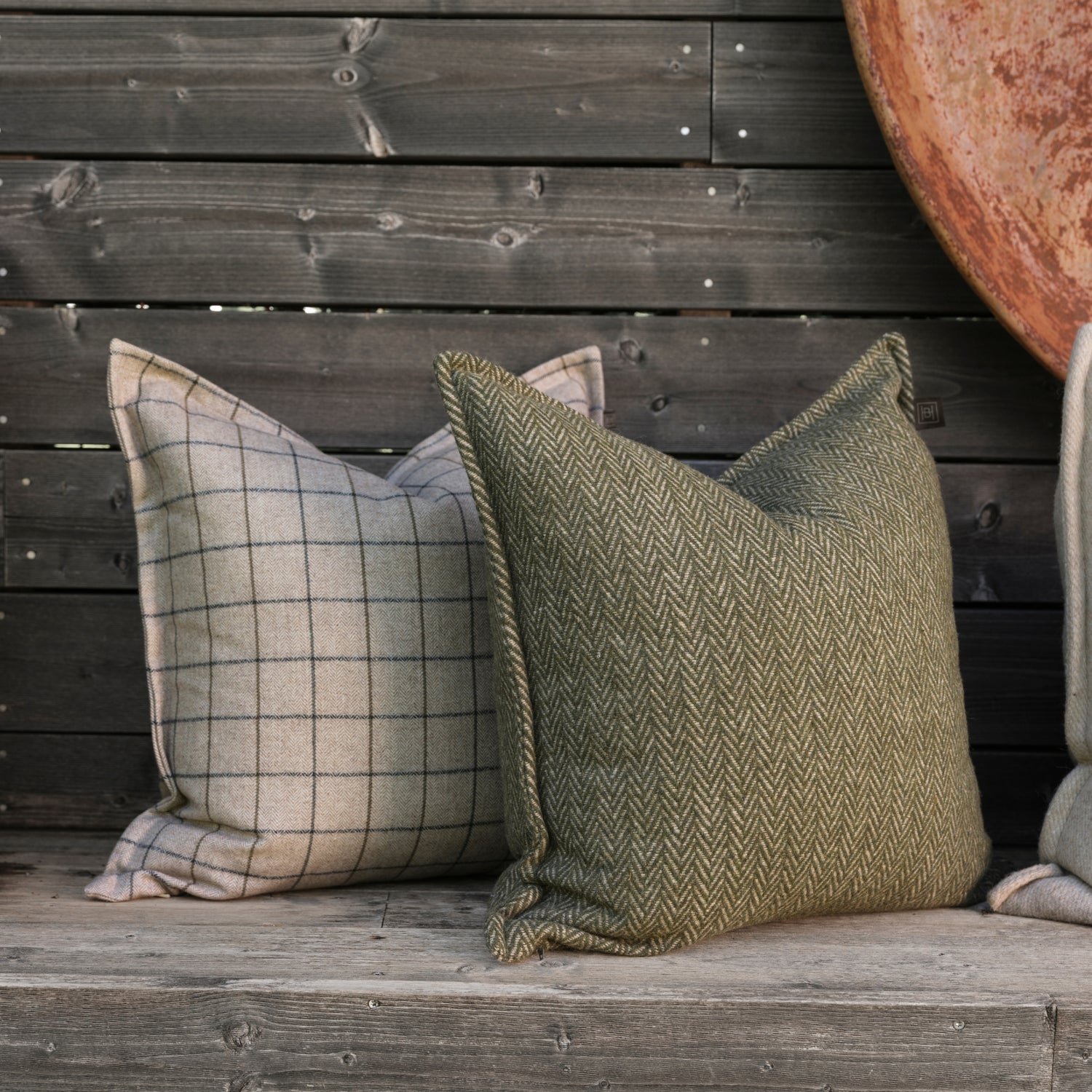 Gi rommet et eksklusivt preg med Halvor Bakke Asima putetrekk. Den grønne fargen og det fine teksturspillet skaper varme og dybde i interiøret. Trekket er laget av resirkulert ull i kombinasjon med slitesterke fibre, som gir et naturlig uttrykk og en behagelig følelse.
