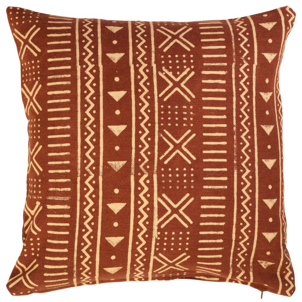 Putetrekket har en dyp rødbrun rustfarge, kombinert med et elegant, gullaktig mønster som gir et varmt og sofistikert uttrykk.