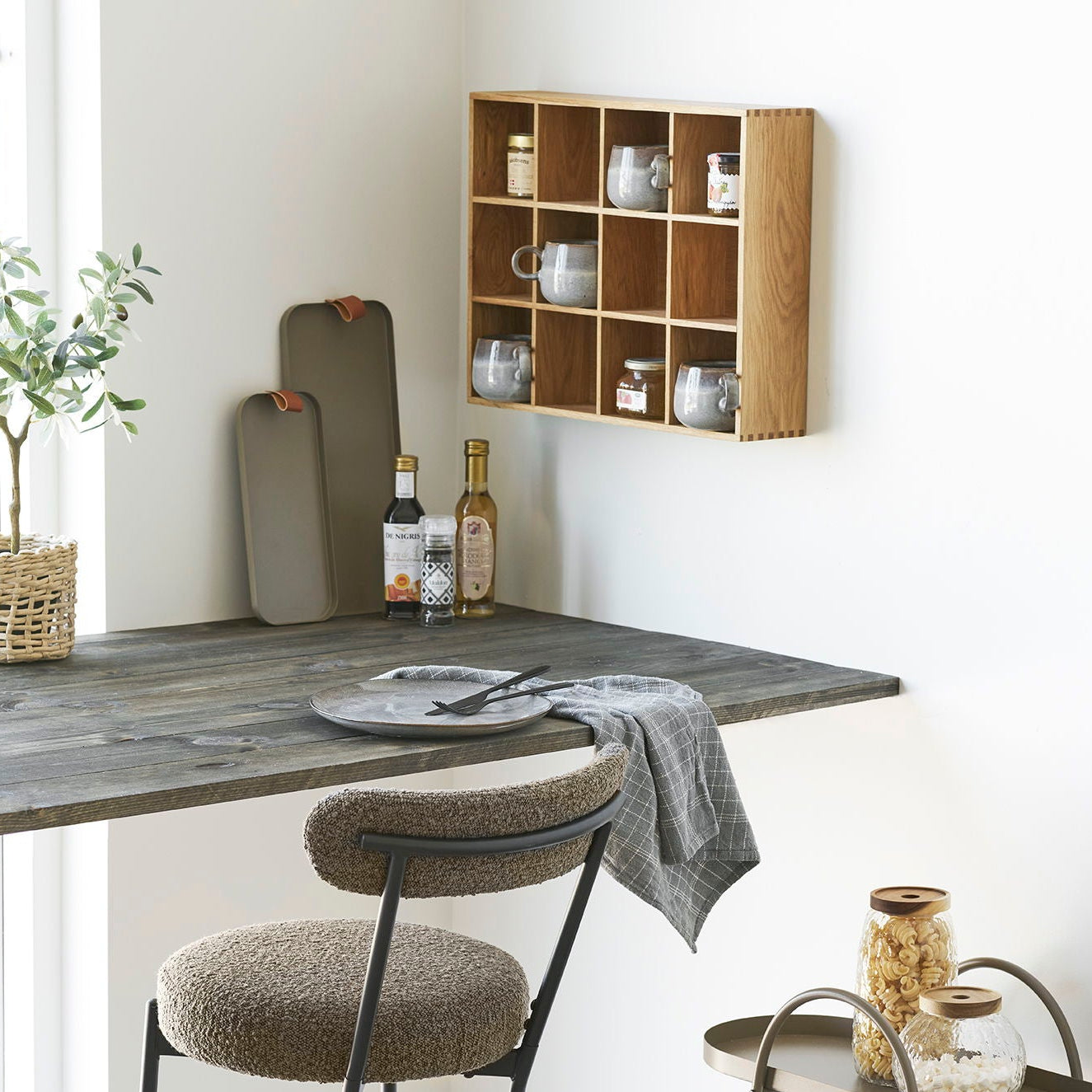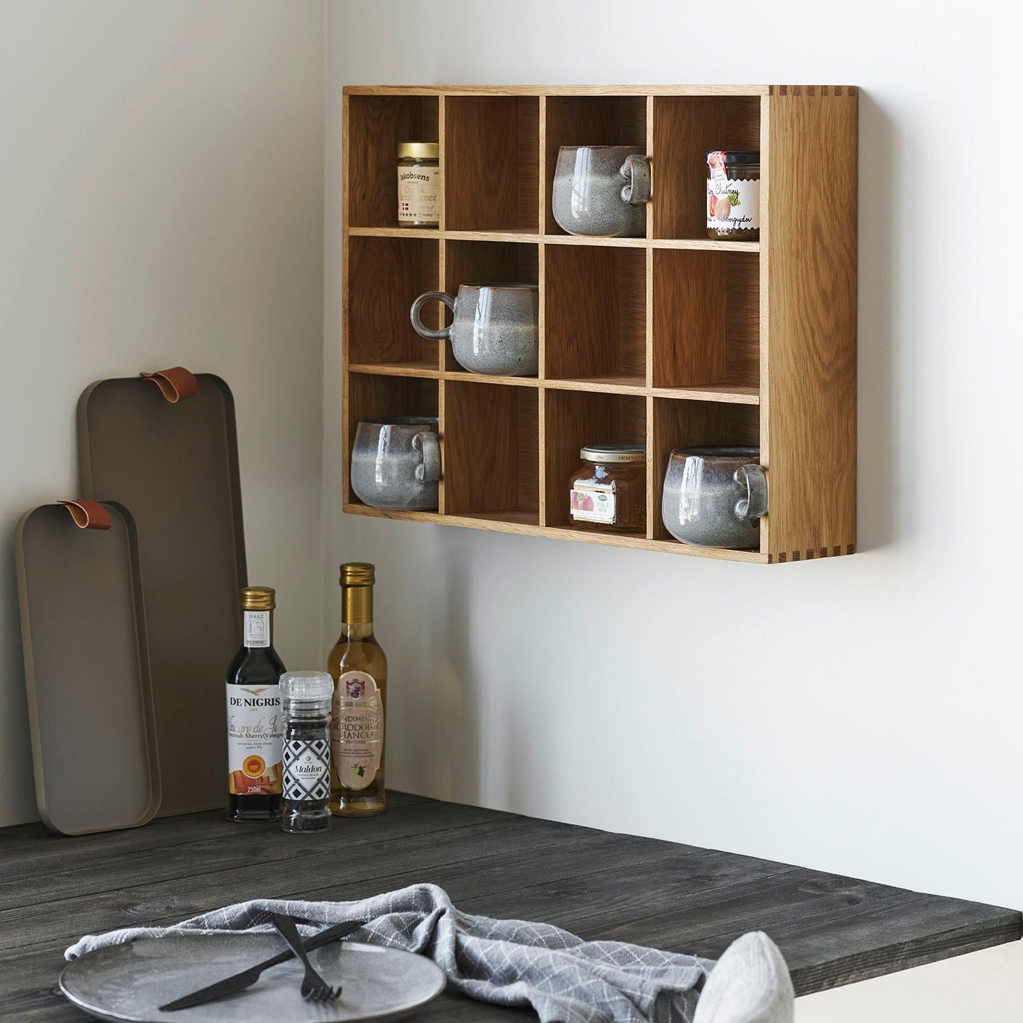 Soria vegghylle i eik og eikefiner natur gir et strukturert og dekorativt uttrykk på veggen. Den kompakte størrelsen på 39 x 51 cm kombinert med flere åpne rom gjør den ideell for både oppbevaring og styling.