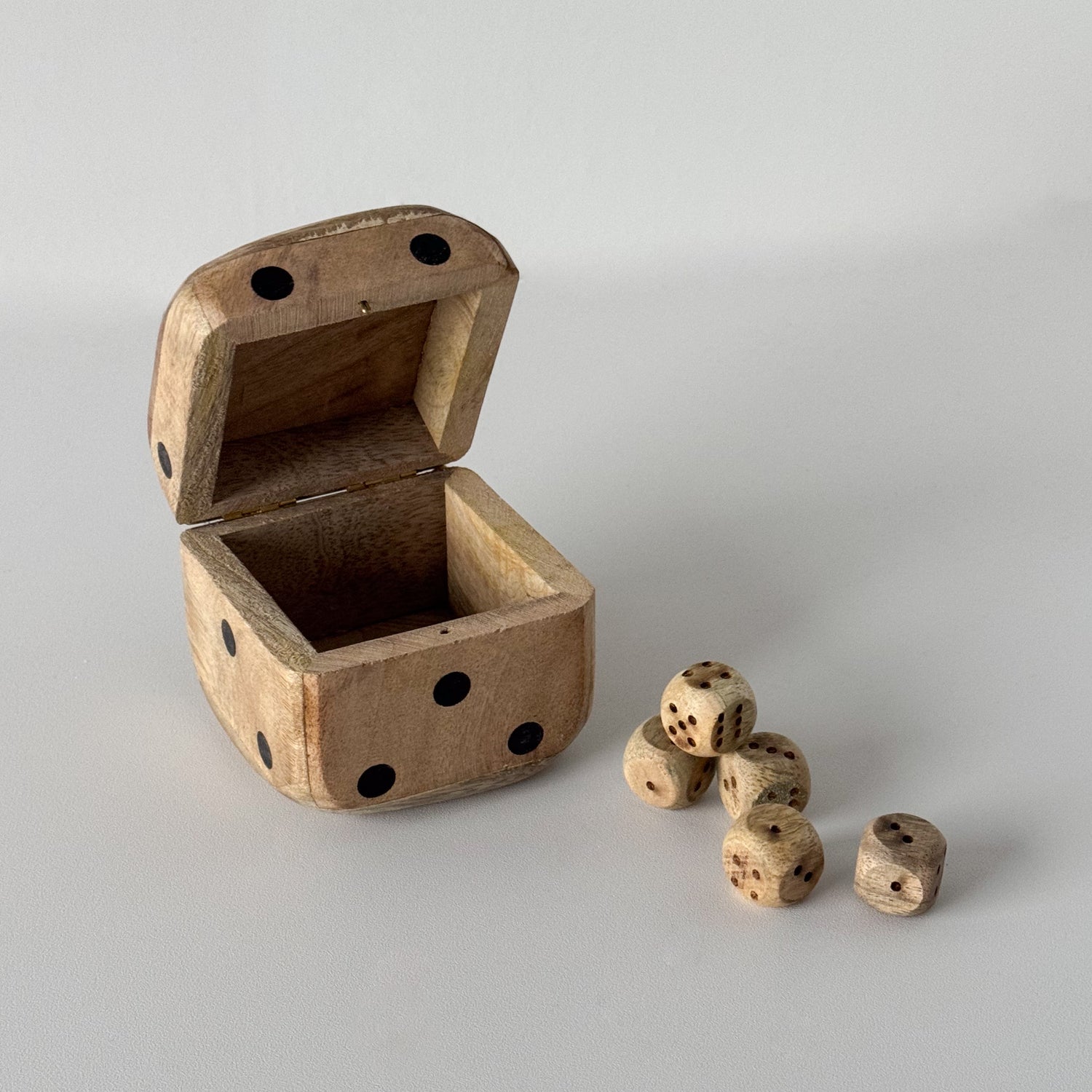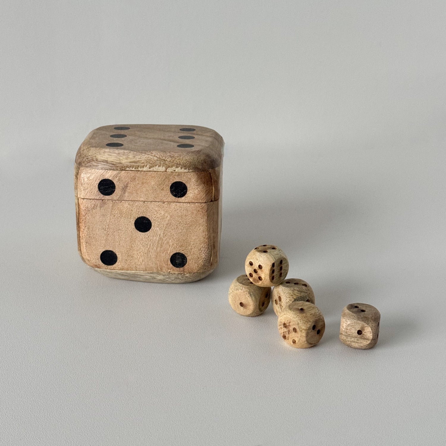 Med oppbevaringsboks formet som en stor terning og 5 terninger i mangotre får du et sett som både er praktisk og fullt av karakter. Den rustikke finishen gir et naturlig og håndlaget uttrykk som gjør at produktet skiller seg ut, både som spill og som pyntegjenstand.