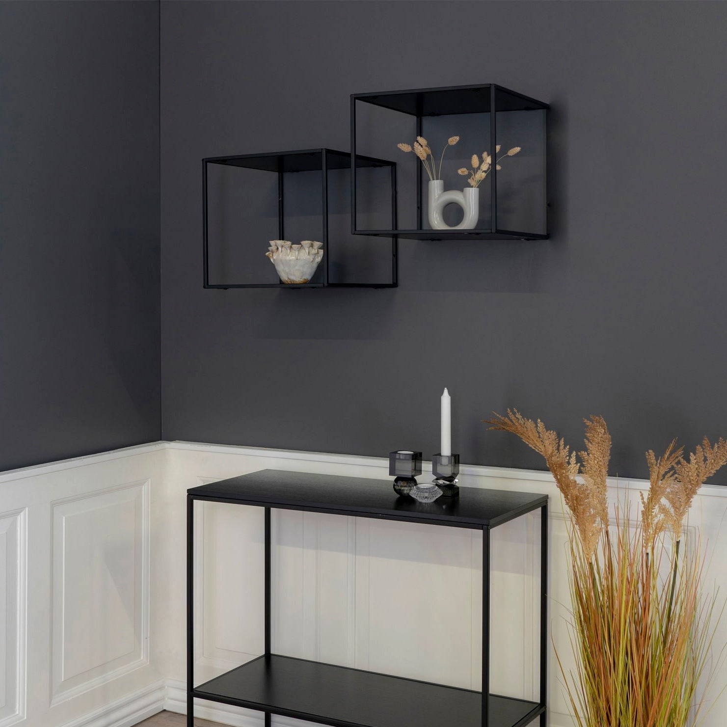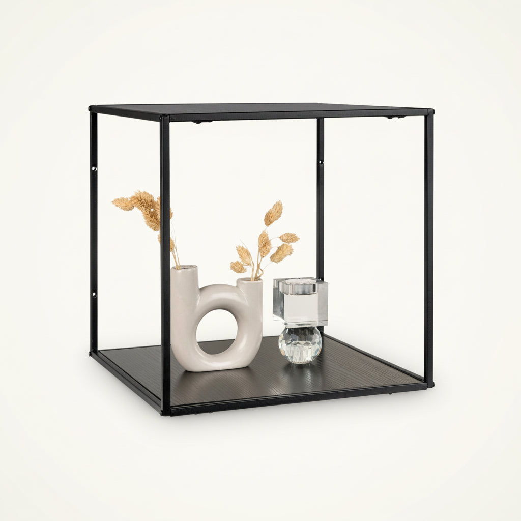36 x 36 x 36 cm gir en romslig kube som passer perfekt til større dekor, vaser og små oppsett. Den sorte metallrammen gir et moderne uttrykk og fungerer like godt i lyse rom som mot mørke vegger. Resultatet er en vegghylle som ser gjennomført ut, selv med få ting på.