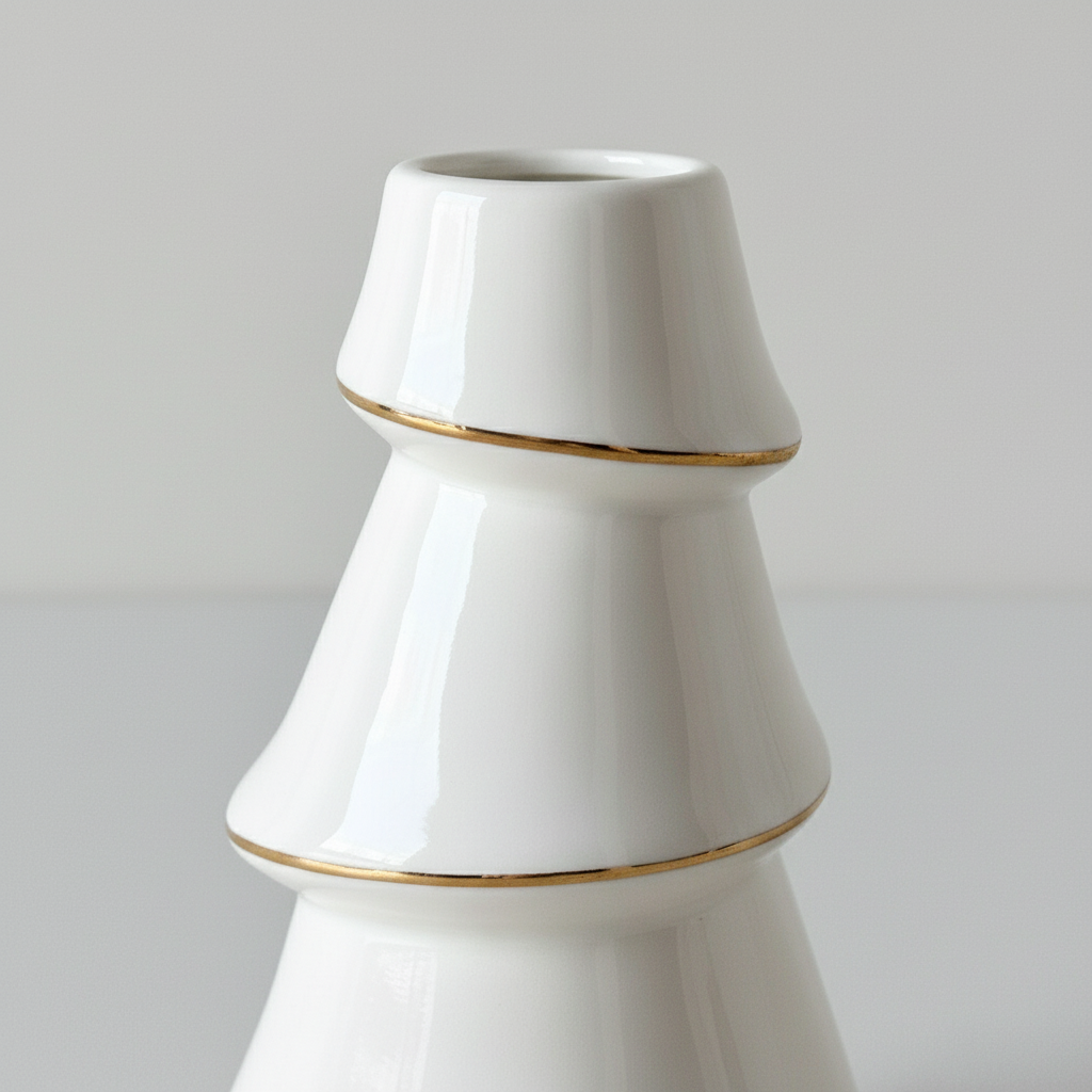 En vakker lysestake i hvit keramikk med en diskret gullkant som gir et hint av luksus. Formen er inspirert av et juletre og passer fint både alene og sammen med annen julepynt. Den gir en varm og rolig stemning på bordet, i vinduet eller på en hylle. Passer til vanlige kronelys.