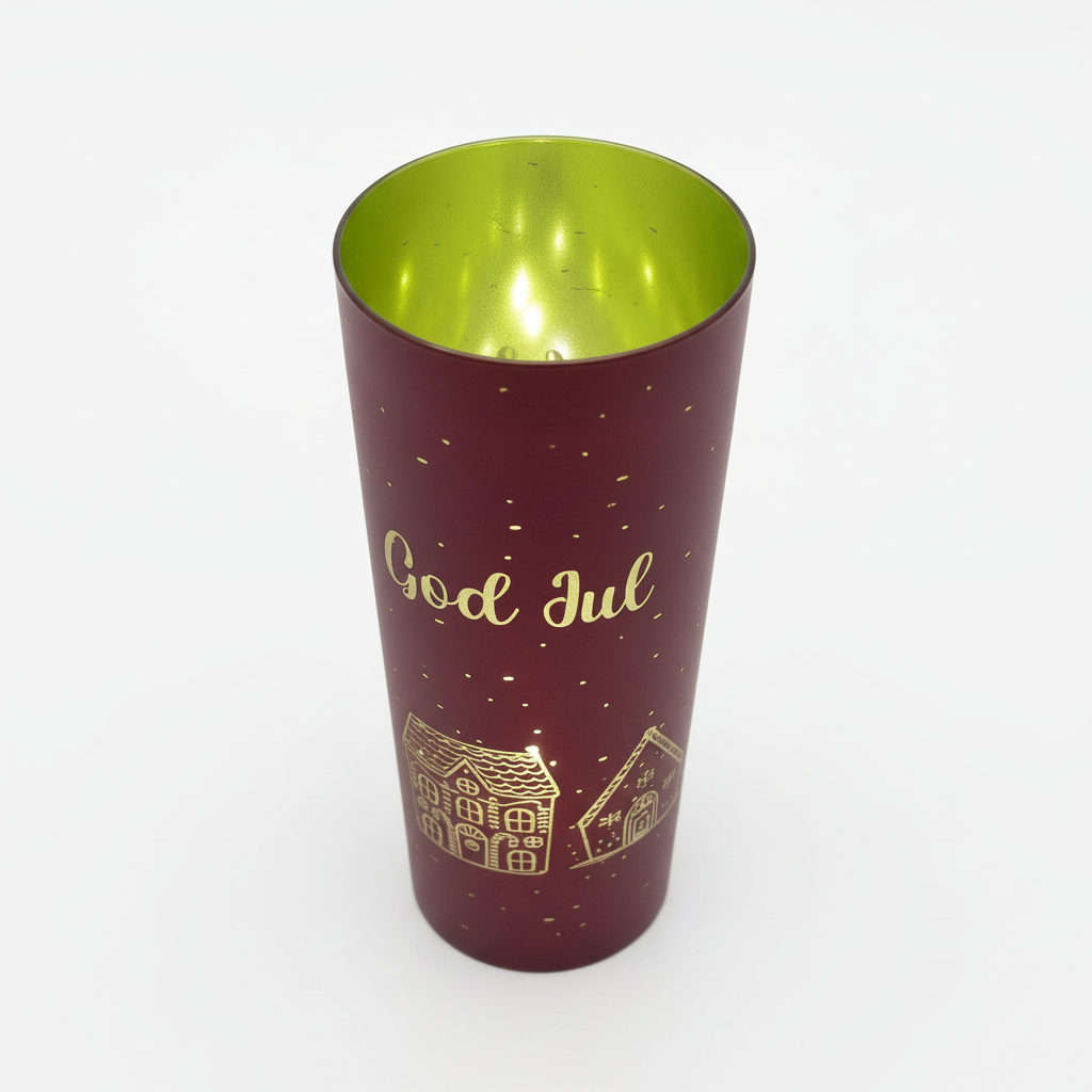 Skap lun og stemningsfull belysning med vår nydelige LED-lykt Pepperkakeby i dyp rød farge. Den sylindriske lykten har utskårne detaljer av en pepperkakeby som lyser vakkert når lyset tennes.