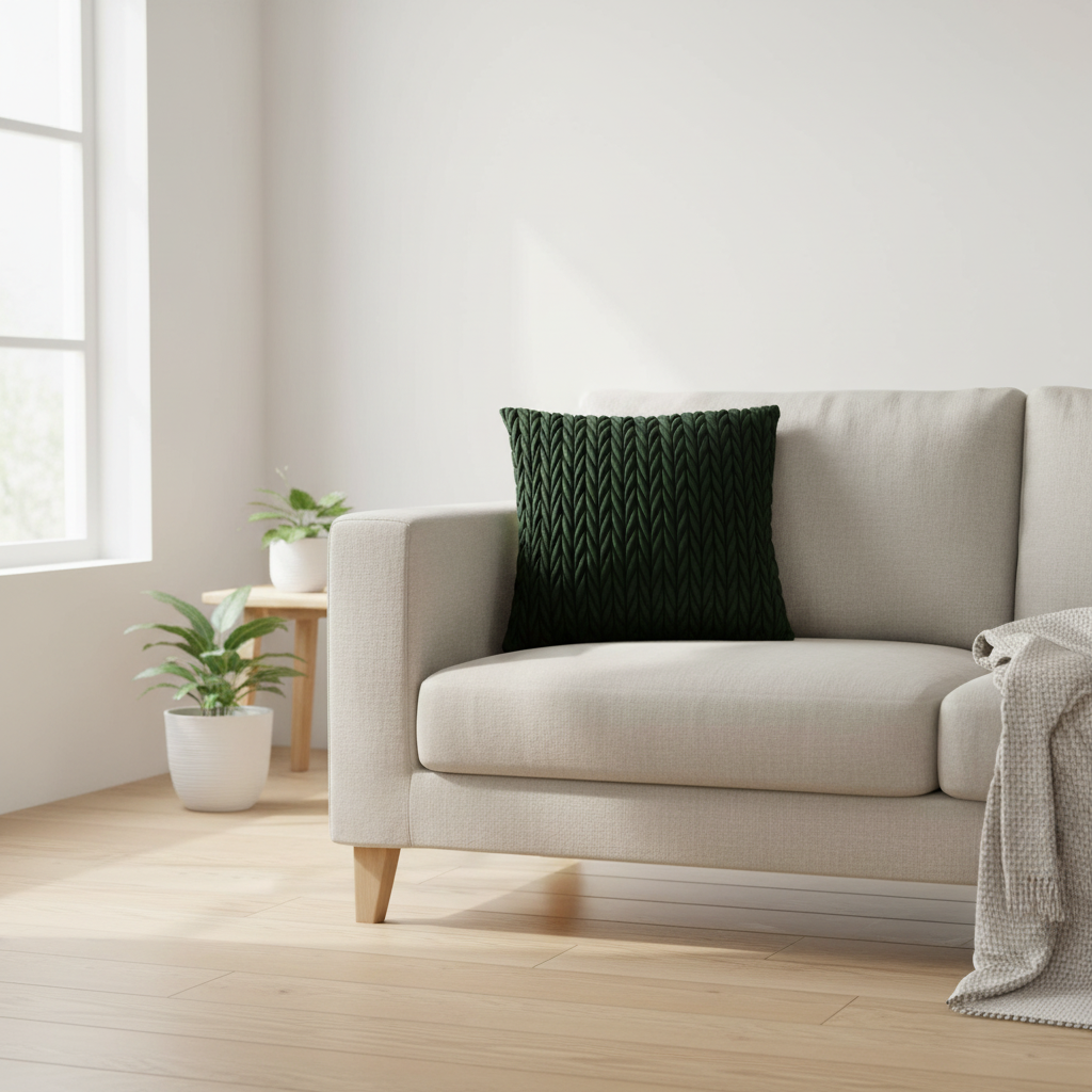 Oppgrader sofakroken med dette elegante putetrekket i dyp flaskegrønn velur. Den flettede strukturen gir et eksklusivt og mykt uttrykk som både er behagelig å ta på og dekorativt i rommet.