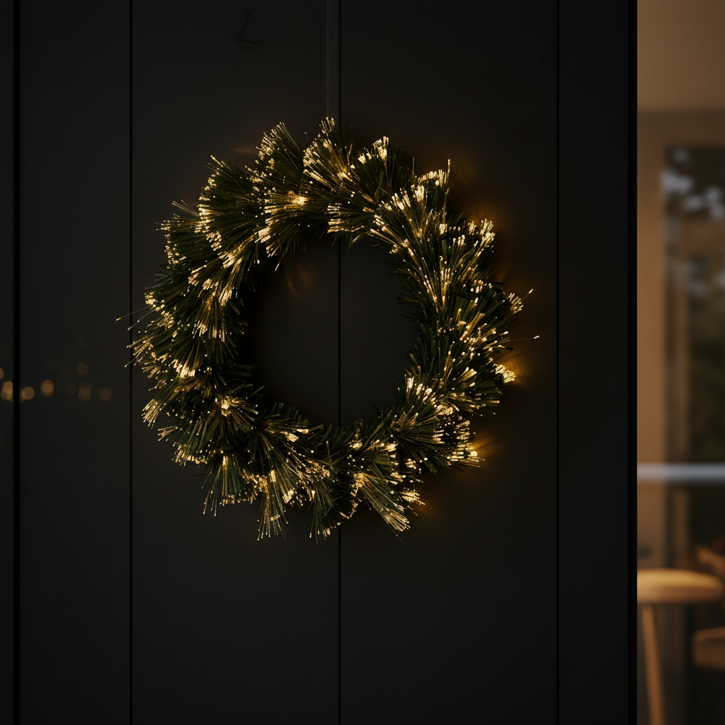 Perfekt til dør, vegg eller vindu. Den fiberoptiske teknologien gir et jevnt og behagelig lys som får kransen til å skinne hele kvelden.