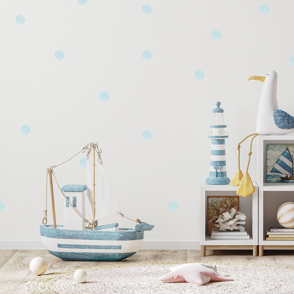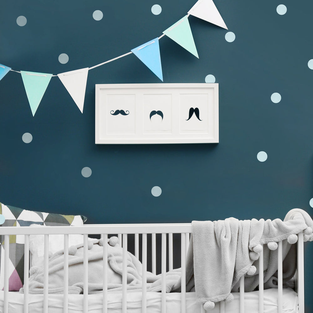 Pakke med 25 runde prikker på 5 cm i diameter, designet og printet for å se ut som vannmaling på lerret. Prikkene kommer i en rolig, dempet blåfarge som du kan arrangere akkurat slik du ønsker for å passe til rommets utseende og stil.