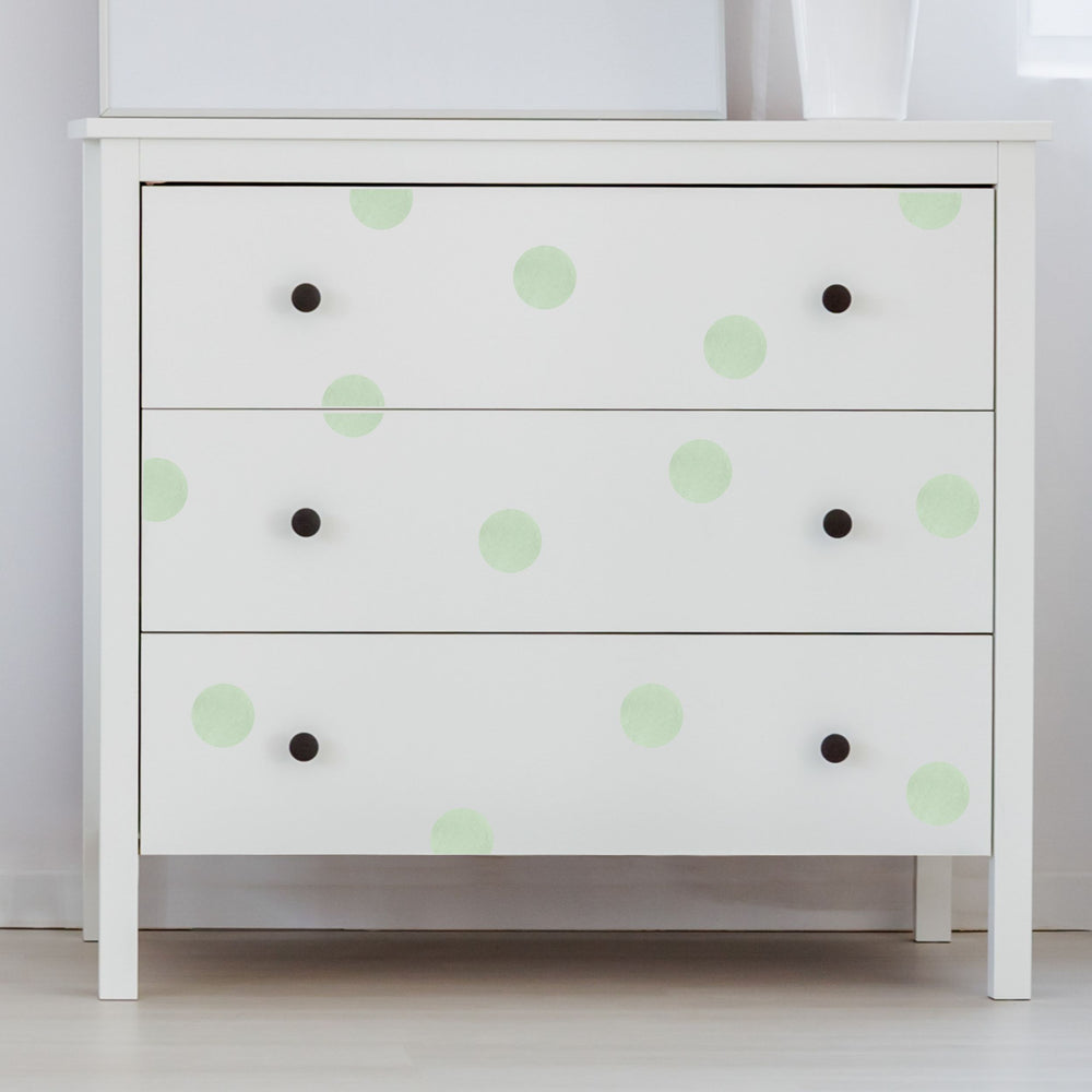 Pakke med 25 runde prikker på 5 cm i diameter, designet og printet for å se ut som vannmaling på lerret. Prikkene kan du arrangere akkurat slik du ønsker for å passe til rommets utseende og stil. Disse flotte prikkene kommer i en sage grønnfarge.