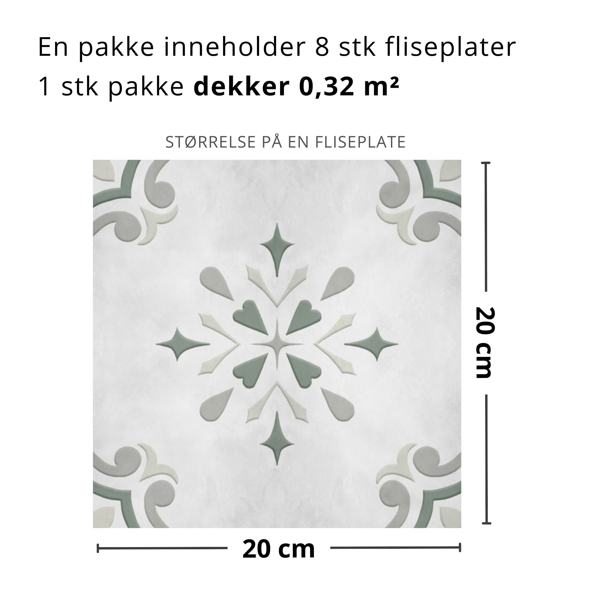 Amilia grønn selvklebende fliser imiterer et klassisk mønster i mørk hvit og grønn. Den gir et dempet og diskret uttrykket i behagelige farger.
