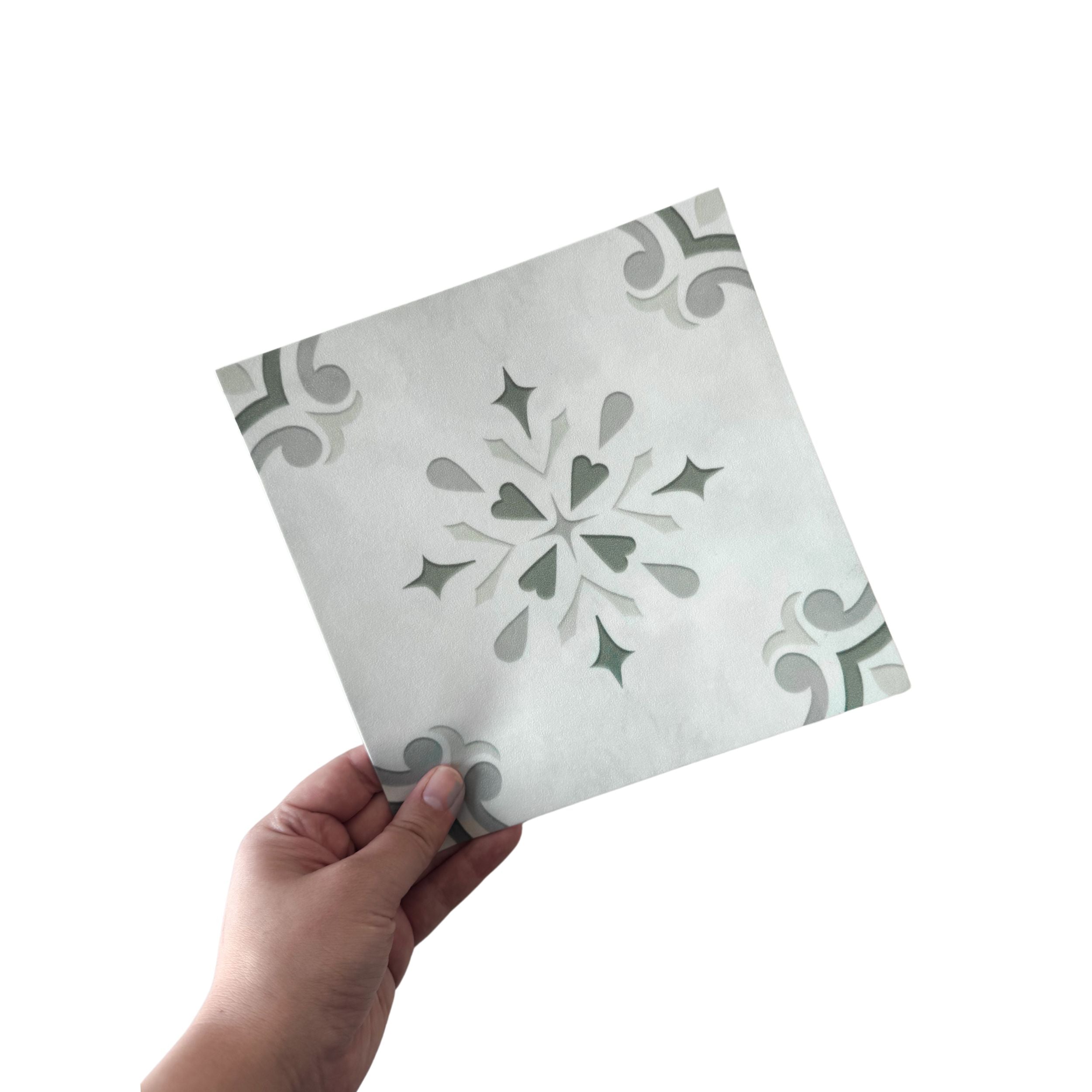 Amilia grønn er en lekker flis med historiske design med dempet grønn detaljer på en grå bakgrunn.