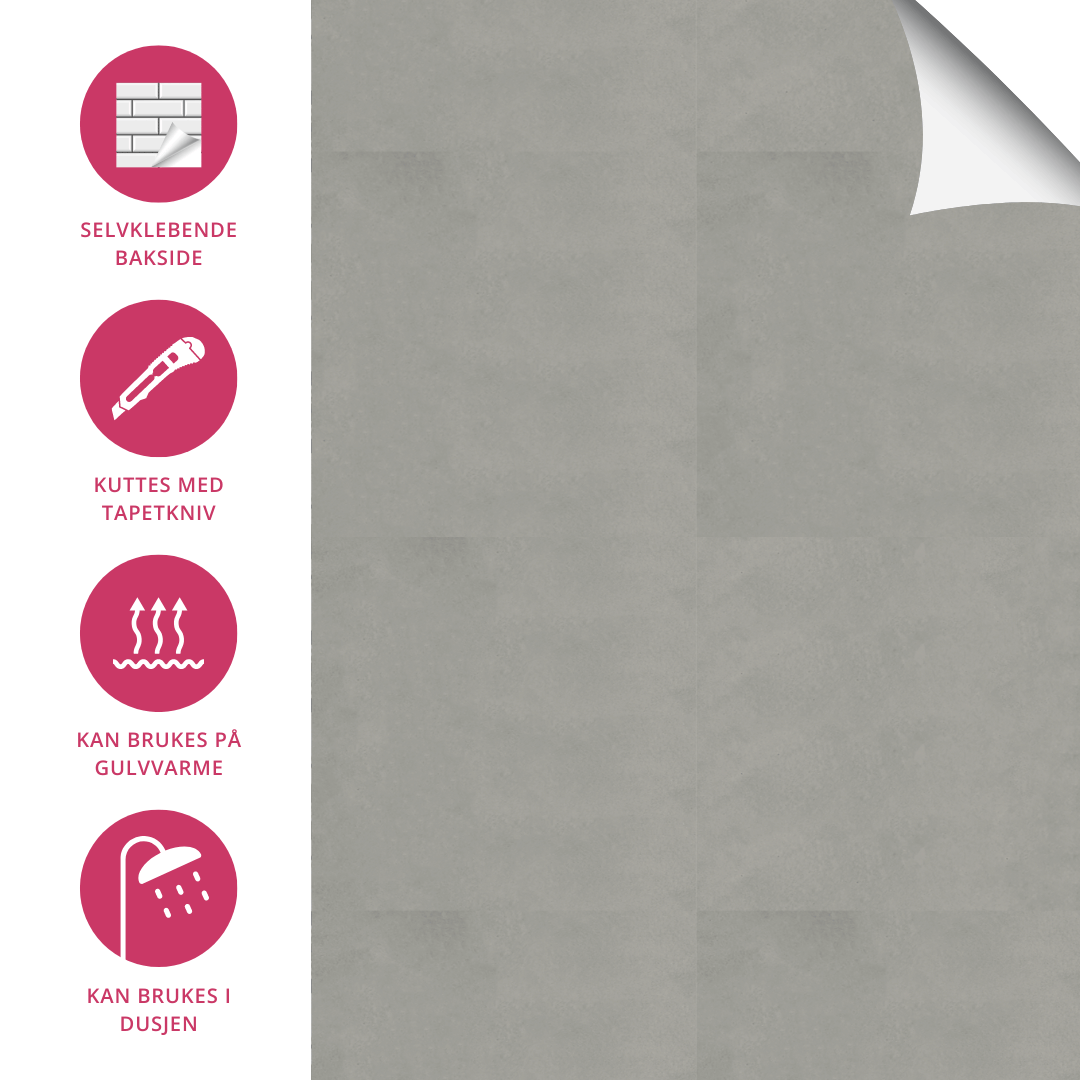 Har du lyst på nytt gulv på badet? Eller kanskje du har lyst på nye fliser i dusjen? Endelig er løsningen her! Disse innovative selvklebende flisene kan festes rett på ditt gamle underlag, til og med på gulv med varme, laminat og i dusjsonen. Ja - du leste riktig! Disse flisene kan brukes på alle slette underlag på både vegg og gulv.