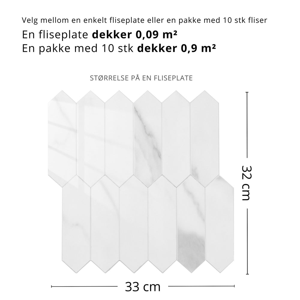 Gi hjemmet ditt et tidløst og luksuriøst uttrykk med Caia lang hexagon selvklebende fliser fra Lindas Dekor. Disse flisene kombinerer det klassiske marmorutseendet i avlange hexagonale mønster. Perfekte for deg som ønsker en rask oppgradering uten behov for fagfolk.