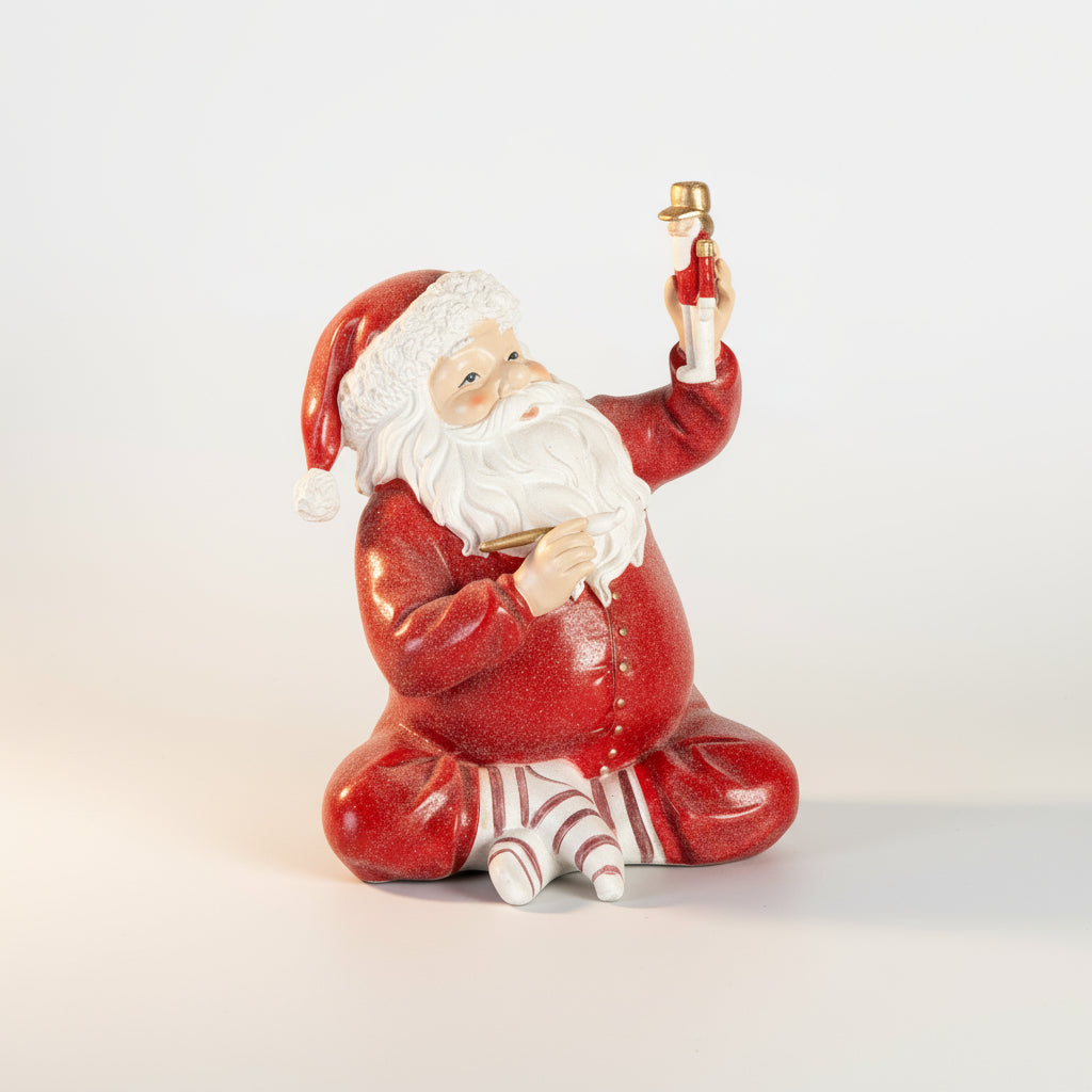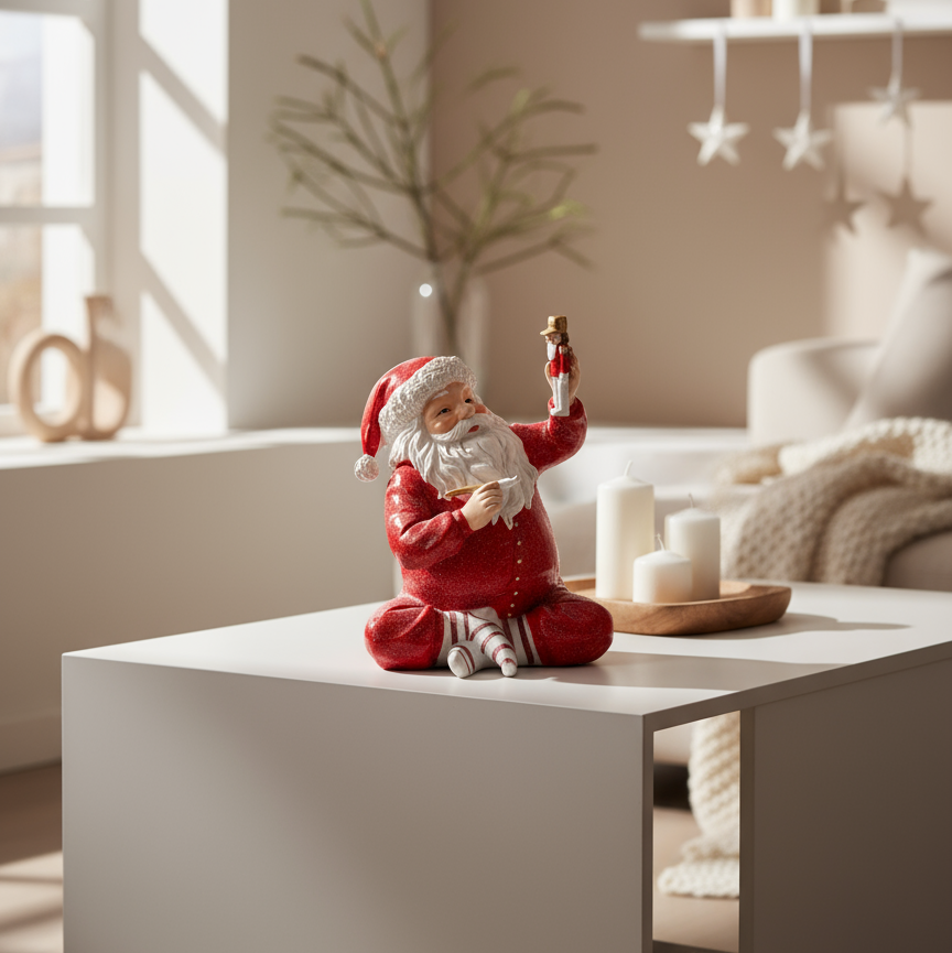 Skap en varm og koselig julestemning med denne sjarmerende nissefiguren. Figuren viser en sittende nisse i glitrende rød drakt som holder en liten gullfigur i hånden. Med sitt detaljerte design og klassiske uttrykk er den perfekt som julepynt på bord, hylle eller i vinduskarmen.