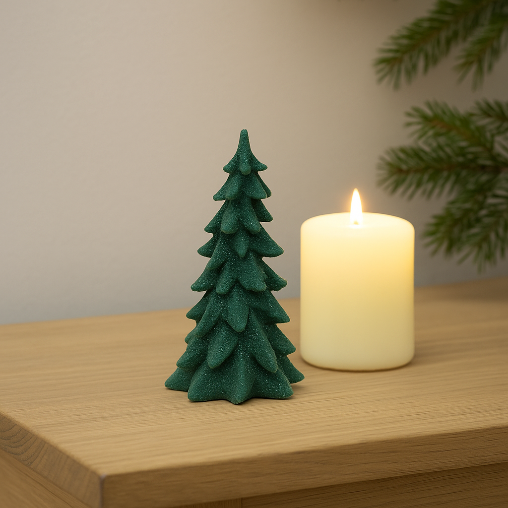 Liten dekorativ juletrefigur i grønn med glitter, plassert på bord ved siden av tent stearinlys – koselig juledekorasjon.