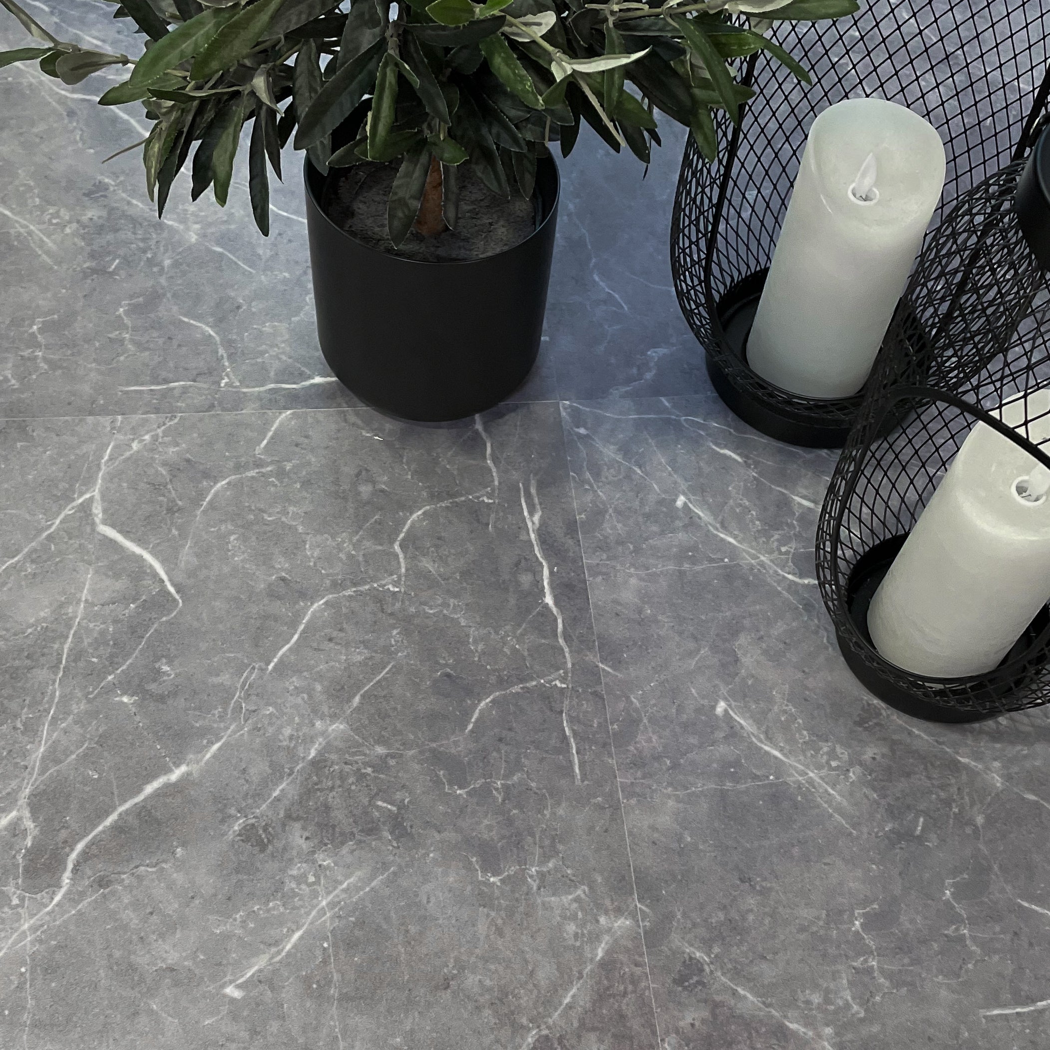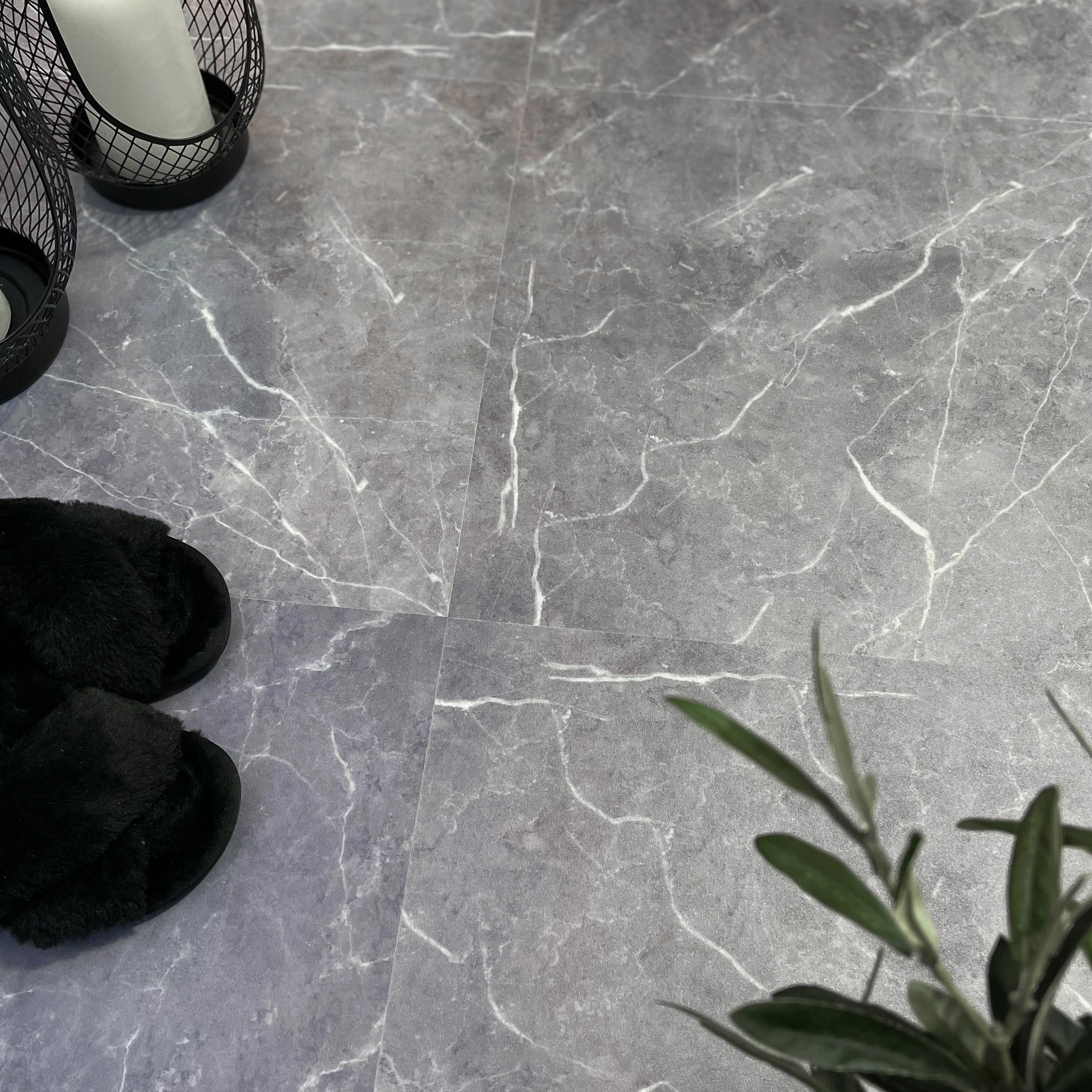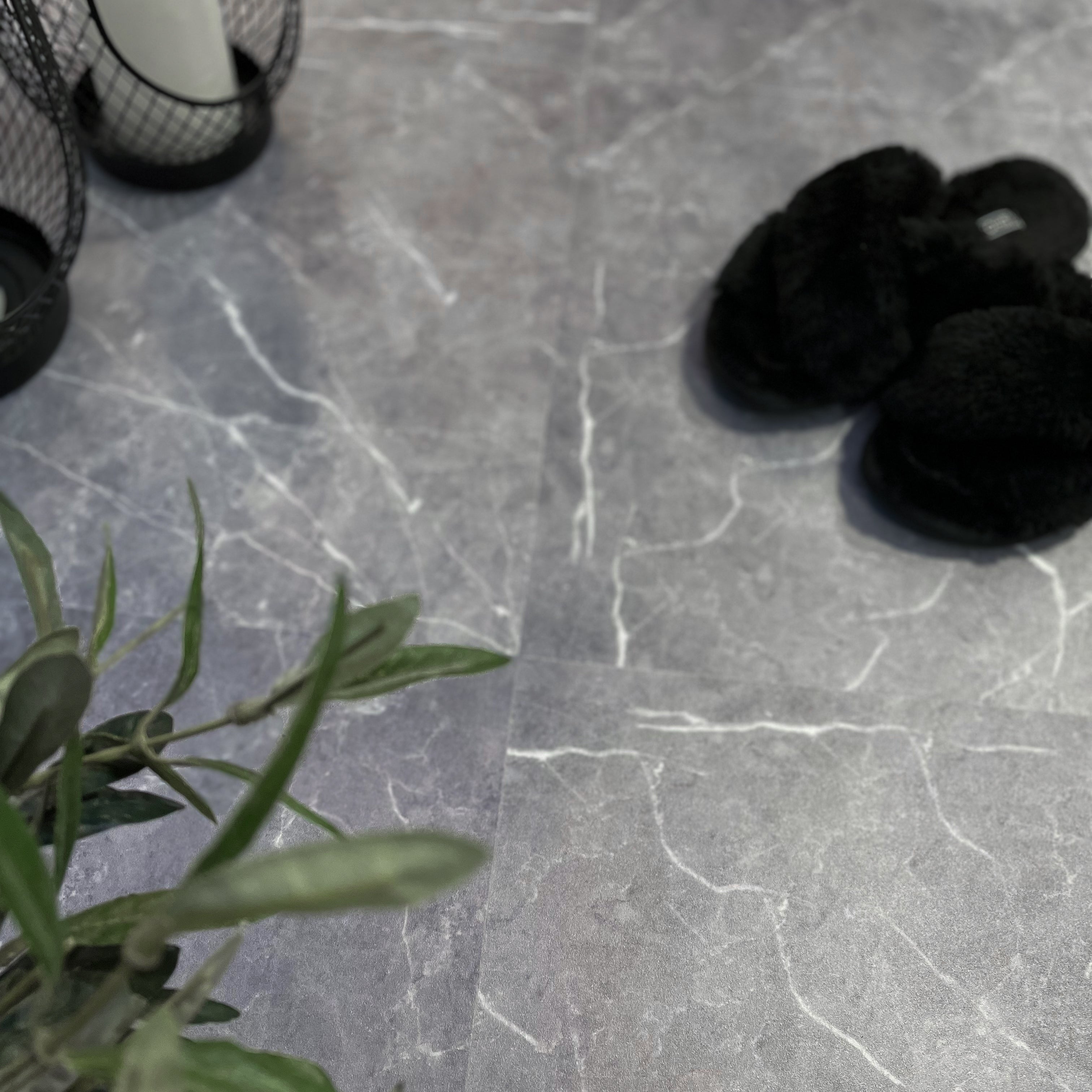 Selvklebende gulvfliser med mørk marmordesign og hvit marmorering.