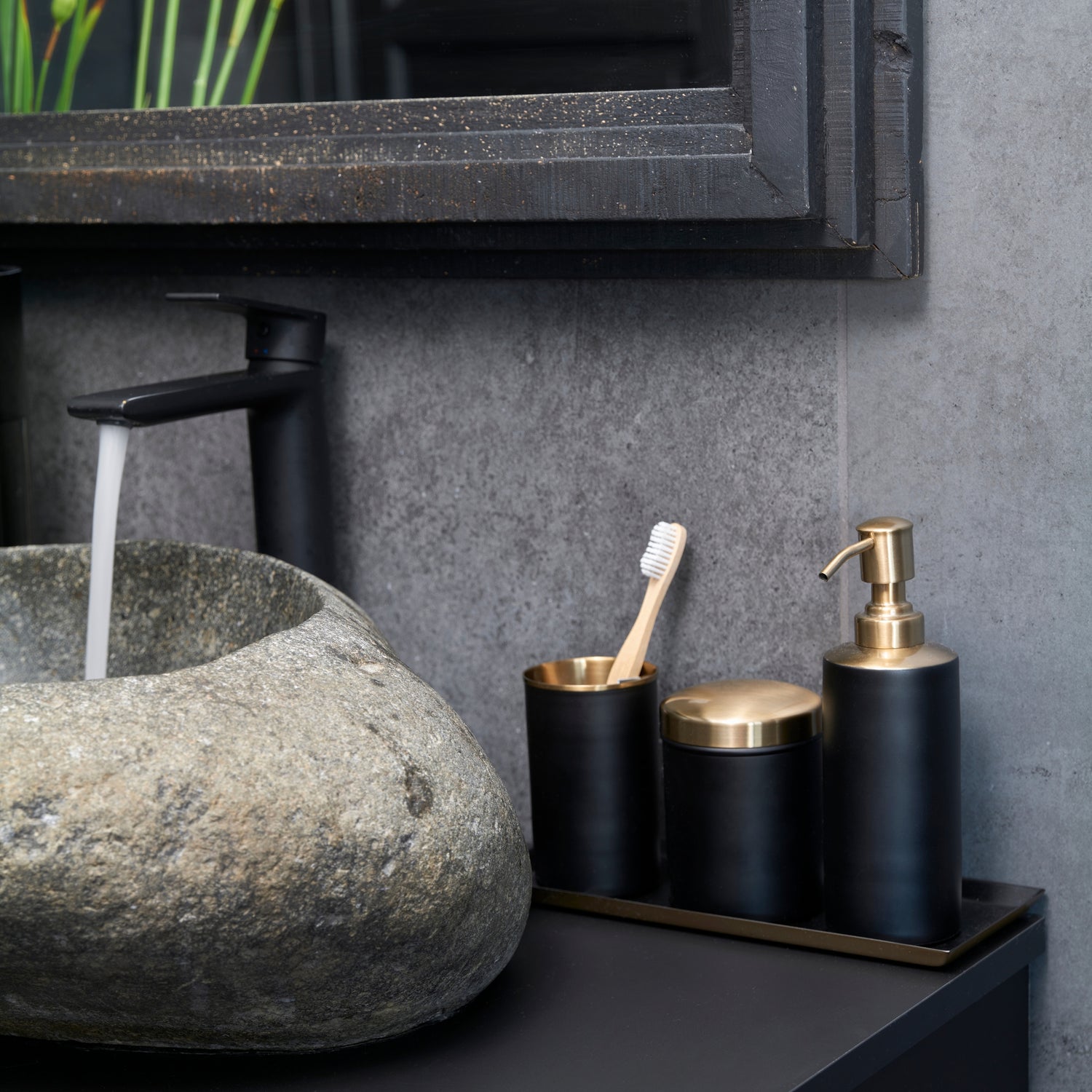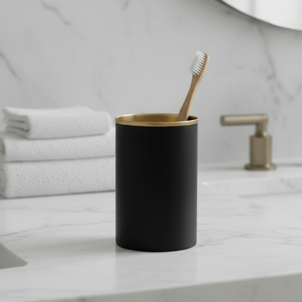 Gio tannbørsteholder tilfører badet et sofistikert uttrykk med sin sorte metallfinish og elegante topp i matt gull. Detaljene og utførelsen er nøye gjennomtenkt, slik du forventer av Halvor Bakke-design.