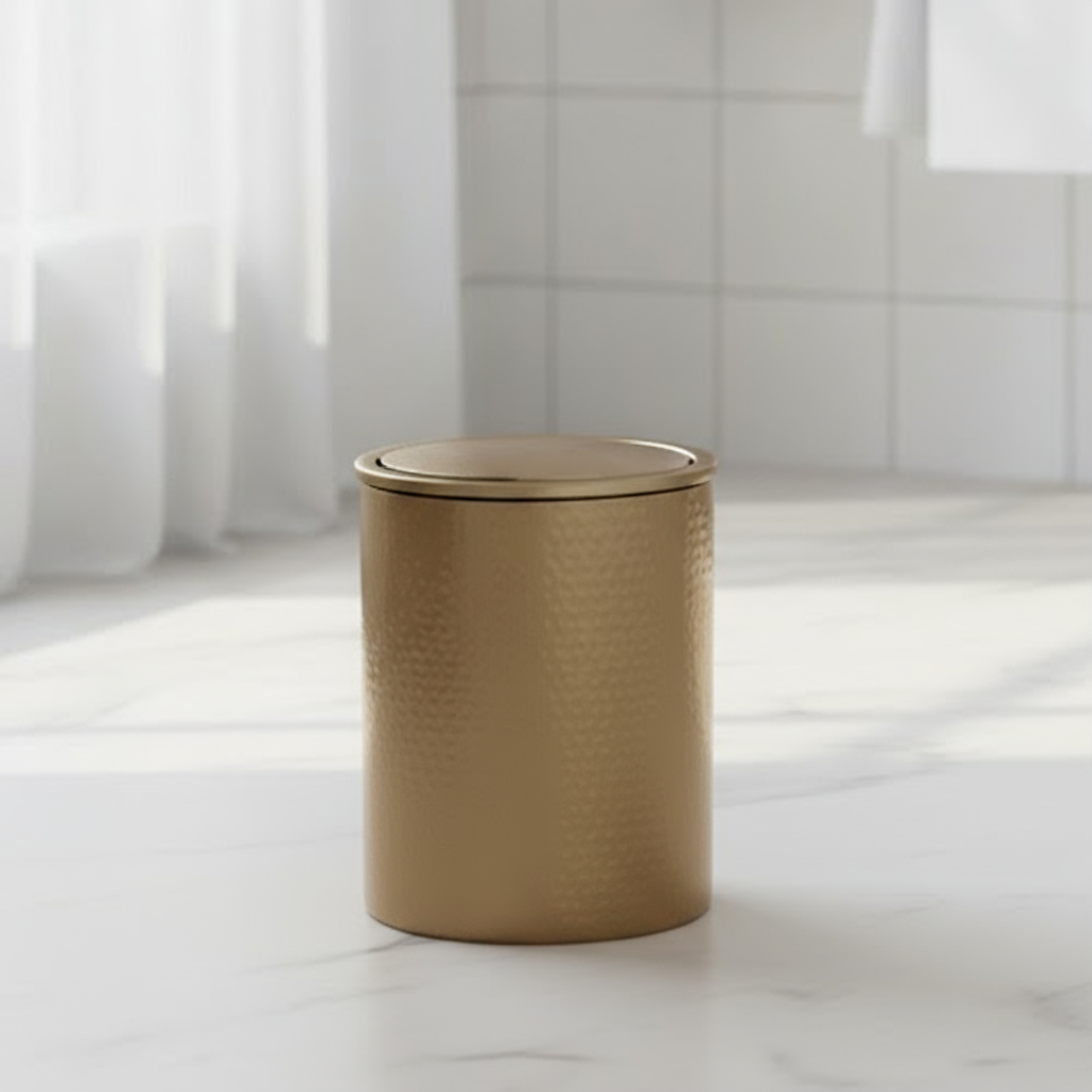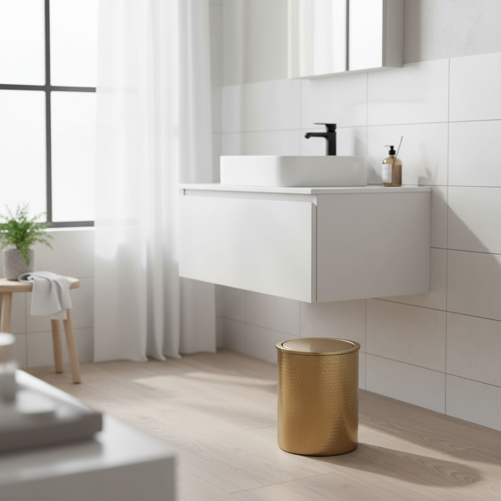 Lutz pedalbøtte fra Halvor Bakke kombinerer funksjonalitet og eksklusivt design. Den bronsefargede metalloverflaten gir en elegant glans, mens det praktiske vipplokket gjør bøtten både hygienisk og lett å bruke.