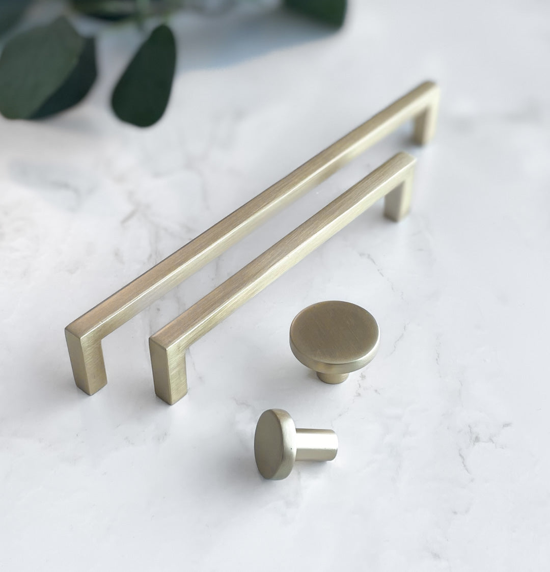 Håndtak børstet messing er håndtaket er stilrent og gir et minimalistisk utrykk med rette kanter, mens innsiden er noe avrundet for å gi et komfortabelt grep. Håndtaket er perfekt til å fornye kjøkkenskap, kommoder, nattbord, baderomsinnredning og mer.
