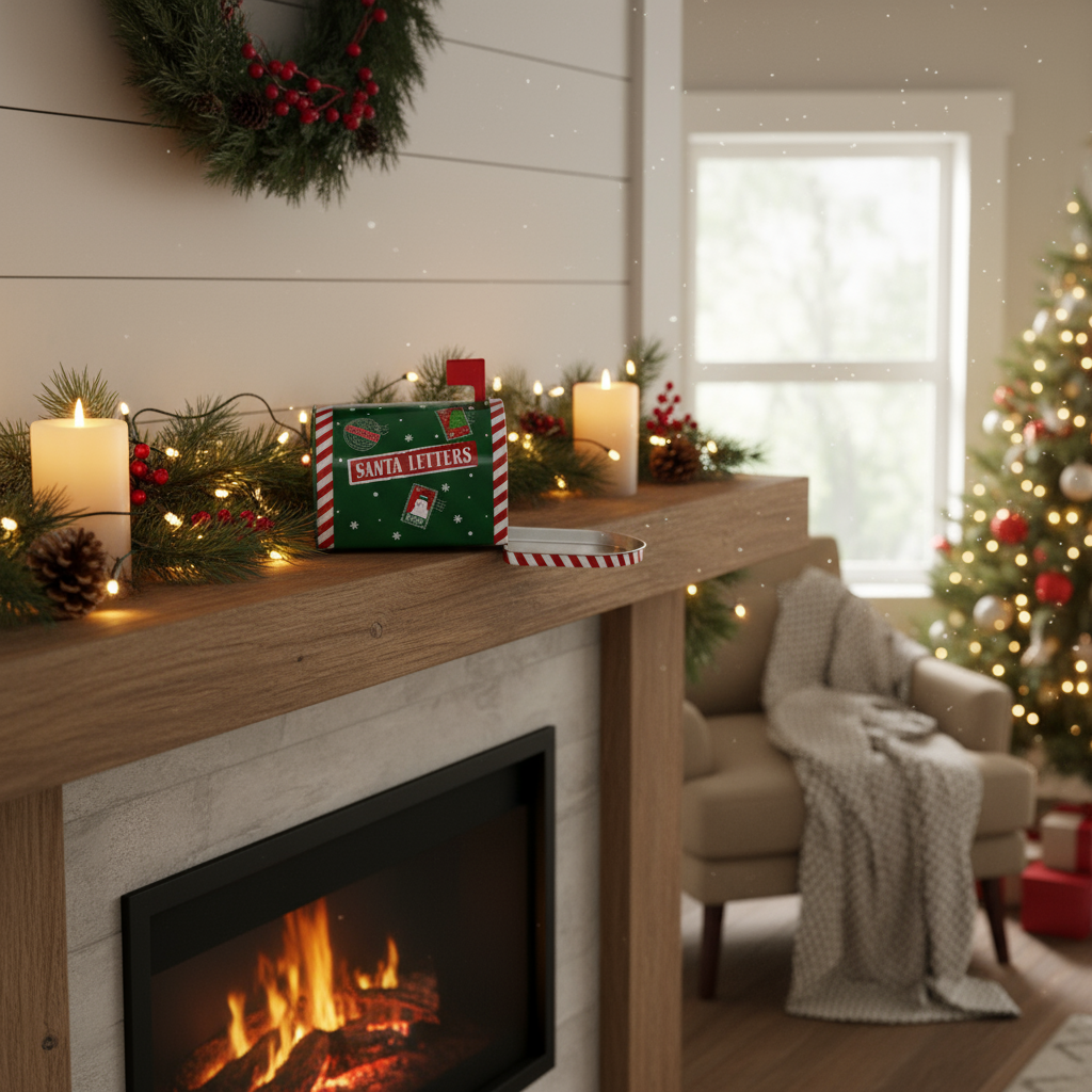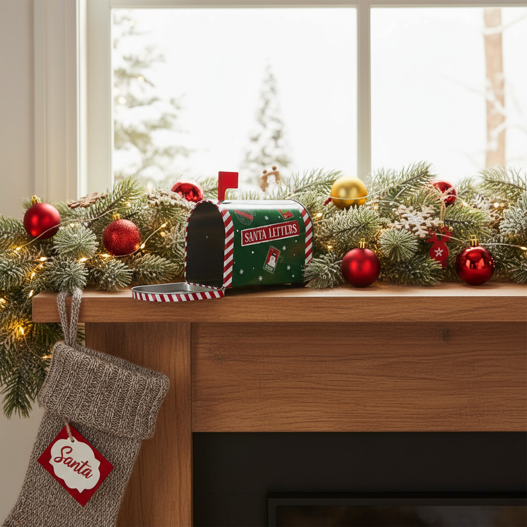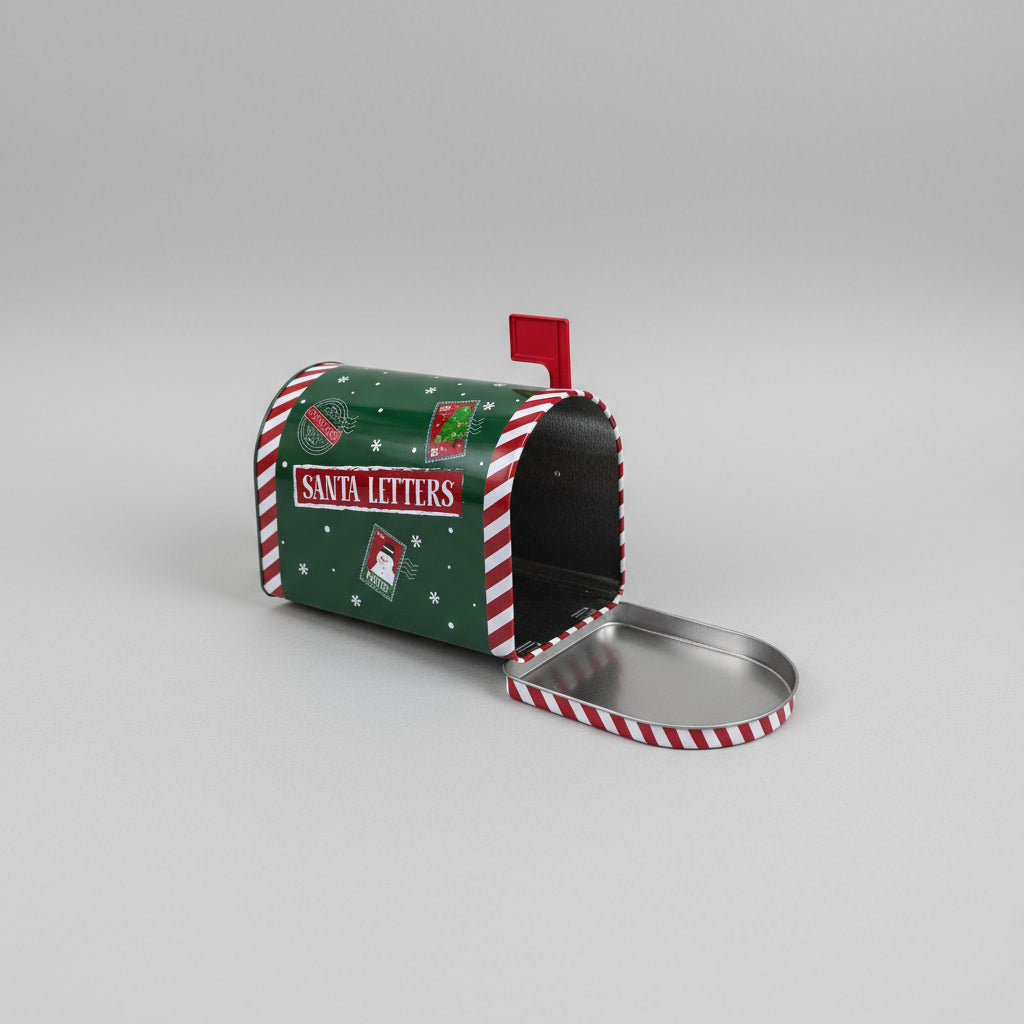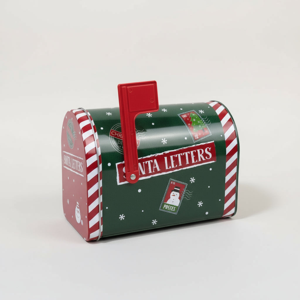 Dekorativ metallboks formet som liten postkasse med julemotiv.
