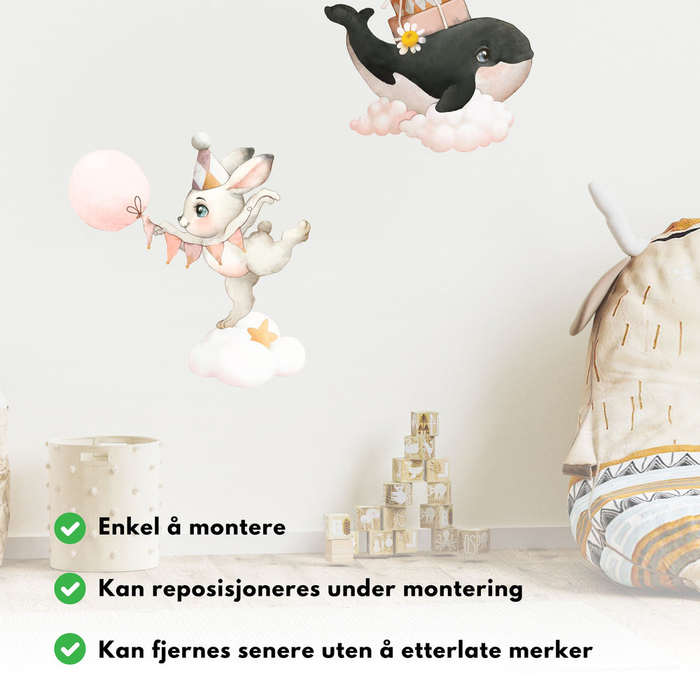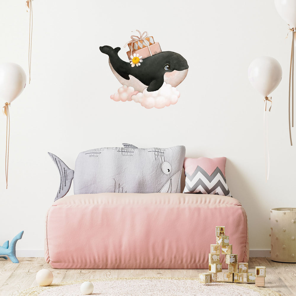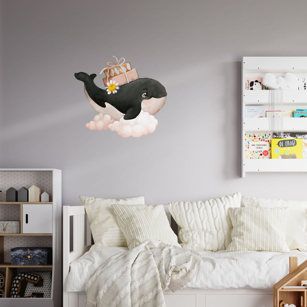 Gjør barnerommet til en drømmeverden med vår fortryllende wallsticker av en søt hval som svever på en sky. Denne unike veggdekoren er laget med en teknikk som etterligner vannmaling på lerret, og gir en følelse av kunstnerisk eleganse og eventyrlig sjarm til barnerommet.