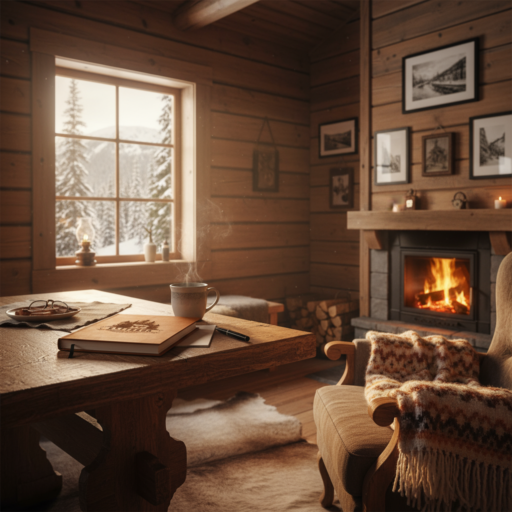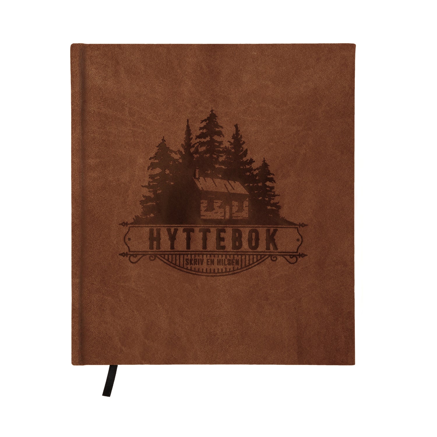 Hyttebok i klassisk brunt med motiv av hytte og furutrær. Perfekt for å samle minner, historier og besøk fra familie og venner på hytta.
