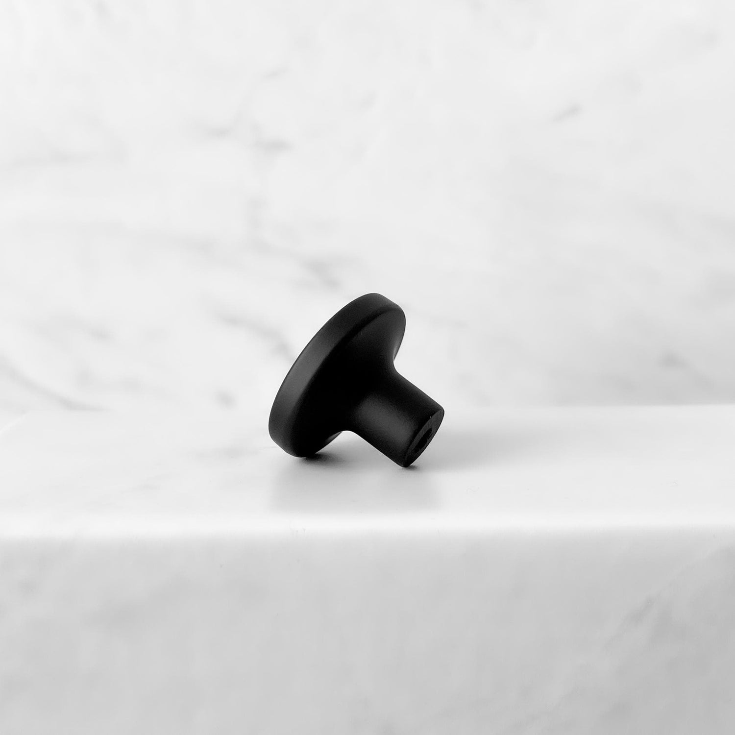 Sort matt knott med rund form og glatt overflate, fotografert liggende på en lys marmorinspirert bakgrunn.