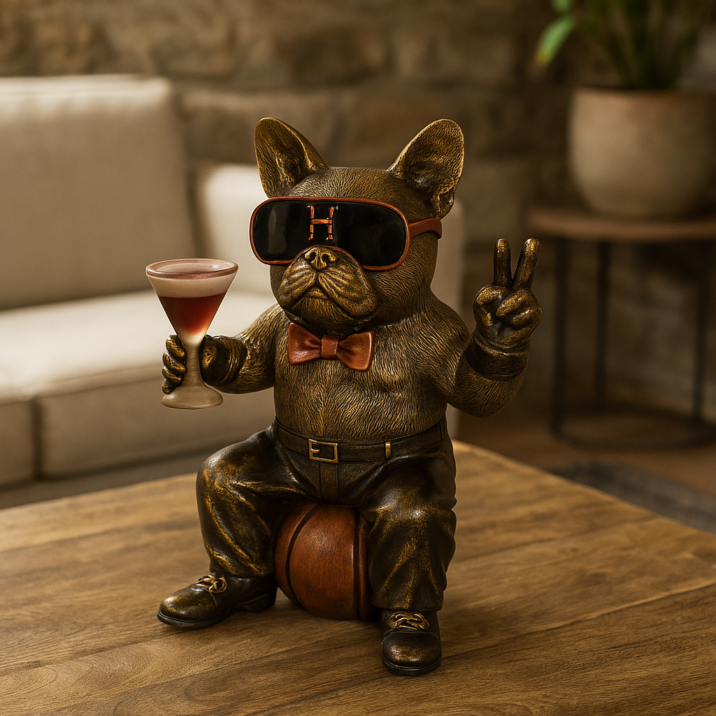 Hundefigur med solbriller, rød sløyfe og glass plassert på trebord i rustikk stue med steinvegg, sofa og varme naturtoner