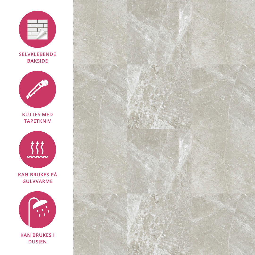 Har du lyst på nytt gulv på badet? Eller kanskje du har lyst på nye fliser i dusjen? Endelig er løsningen her! Disse innovative selvklebende flisene kan festes rett på ditt gamle underlag, til og med på gulv med varme, laminat og i dusjsonen. Ja - du leste riktig! Disse flisene kan brukes på alle slette underlag på både vegg og gulv.