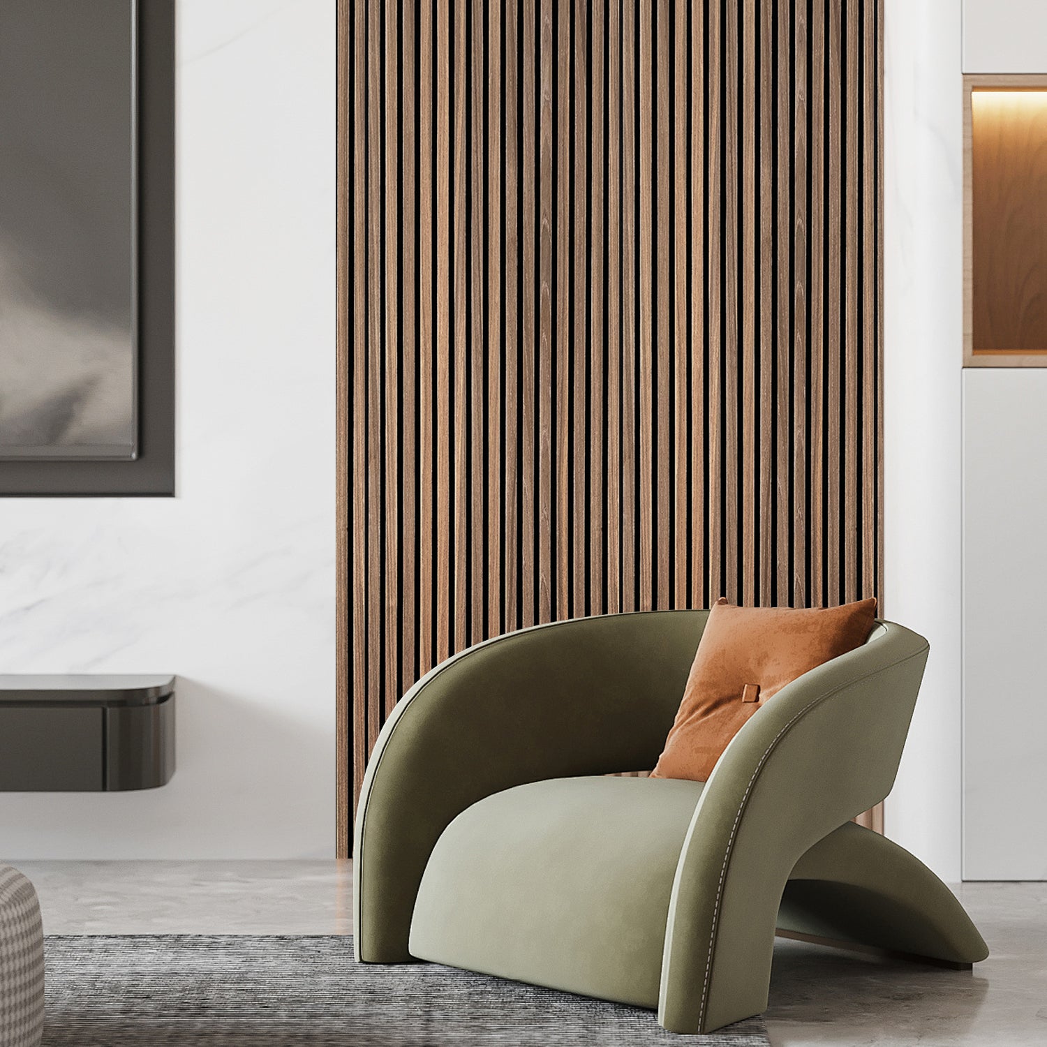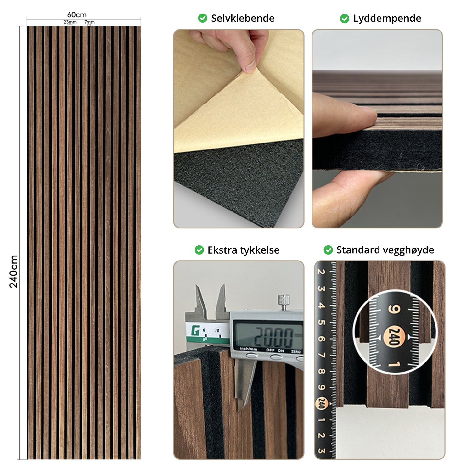 Gi veggene dine et tidløst uttrykk med våre selvklebende spileplater i klassisk valnøtt. Den varme trefineren kombinert med mørk akustikkfilt skaper en eksklusiv kontrast, og med den ferdige limflaten på baksiden kan du sette opp en hel vegg på få minutter – helt uten spiker og skruer.