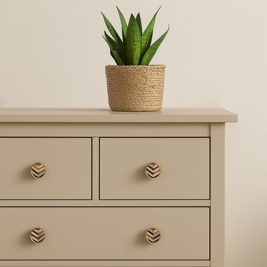Forvandle utseendet på dine møbler med vår eksklusive skuff- og skapknott med marketeri treverk. Denne unike knotten kombinerer naturlig skjønnhet og detaljert håndverk, noe som gir et sofistikert og personlig preg til kjøkken, bad, og andre oppbevaringsmøbler i hjemmet ditt.