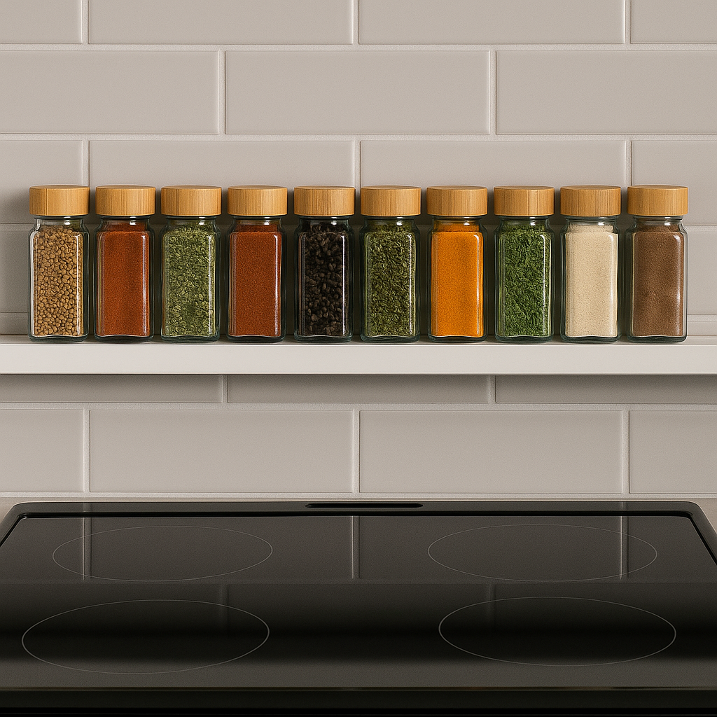 Lei av rotete krydderhylle? Da er disse moderne, firkantete krydderglassene perfekte for deg. Hold kjøkkenet ditt ryddig og organisert med denne populære pakken med krydderglass. Krydderglasset kommer med strølokk.