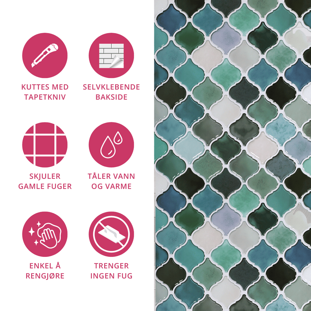 Lanterne blå/grønn selvklebende veggflis gir hjemmet ditt et friskt og eksklusivt preg med sitt vakre lanterne-mønster i nydelige blå og grønntoner. Perfekt til deg som vil fornye kjøkken, toalett eller vaskerom. Raskt, enkelt og uten behov for håndverker.