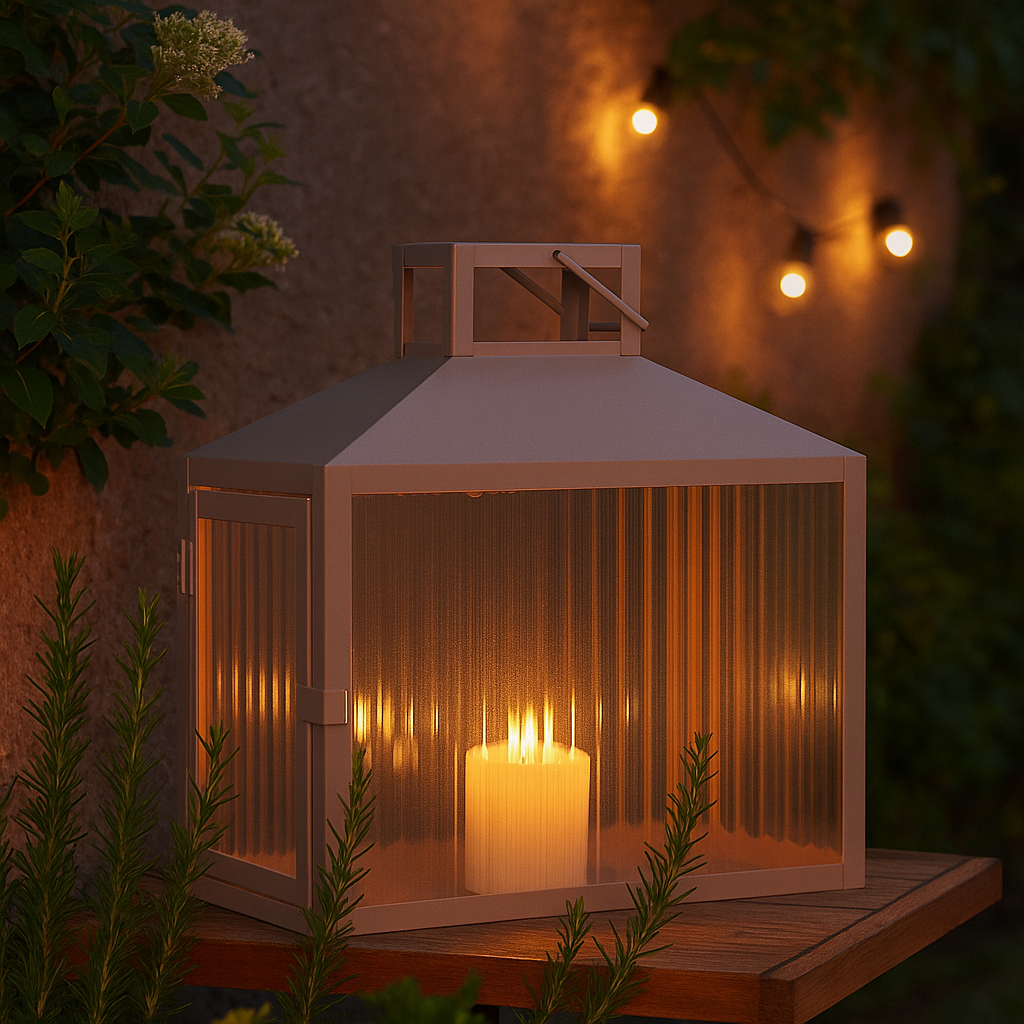 Denne beige lanternen fra House Nordic er en smakfull og dekorativ belysningsdetalj som tilfører varme og sjarm til ethvert rom eller uterom.