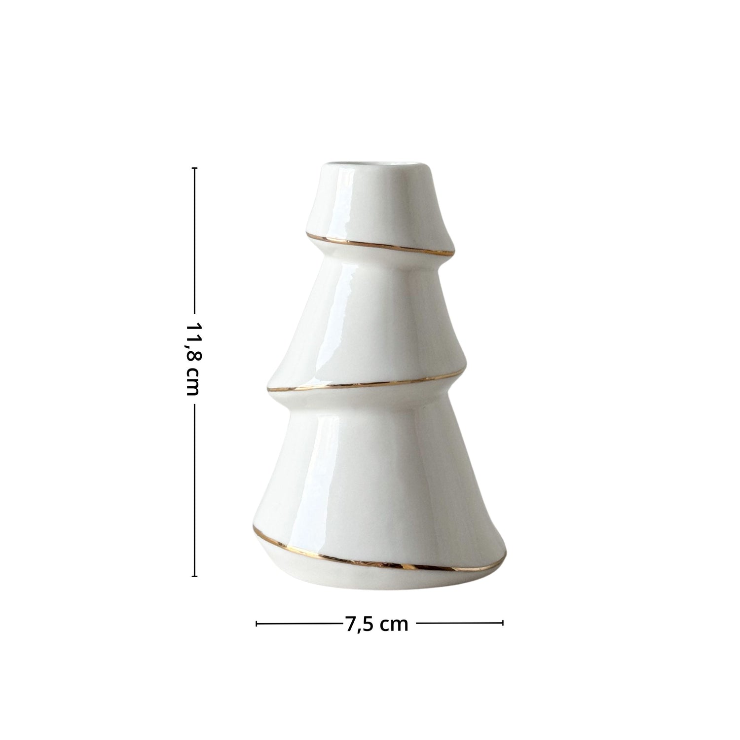 En vakker lysestake i hvit keramikk med en diskret gullkant som gir et hint av luksus. Formen er inspirert av et juletre og passer fint både alene og sammen med annen julepynt. Den gir en varm og rolig stemning på bordet, i vinduet eller på en hylle. Passer til vanlige kronelys.