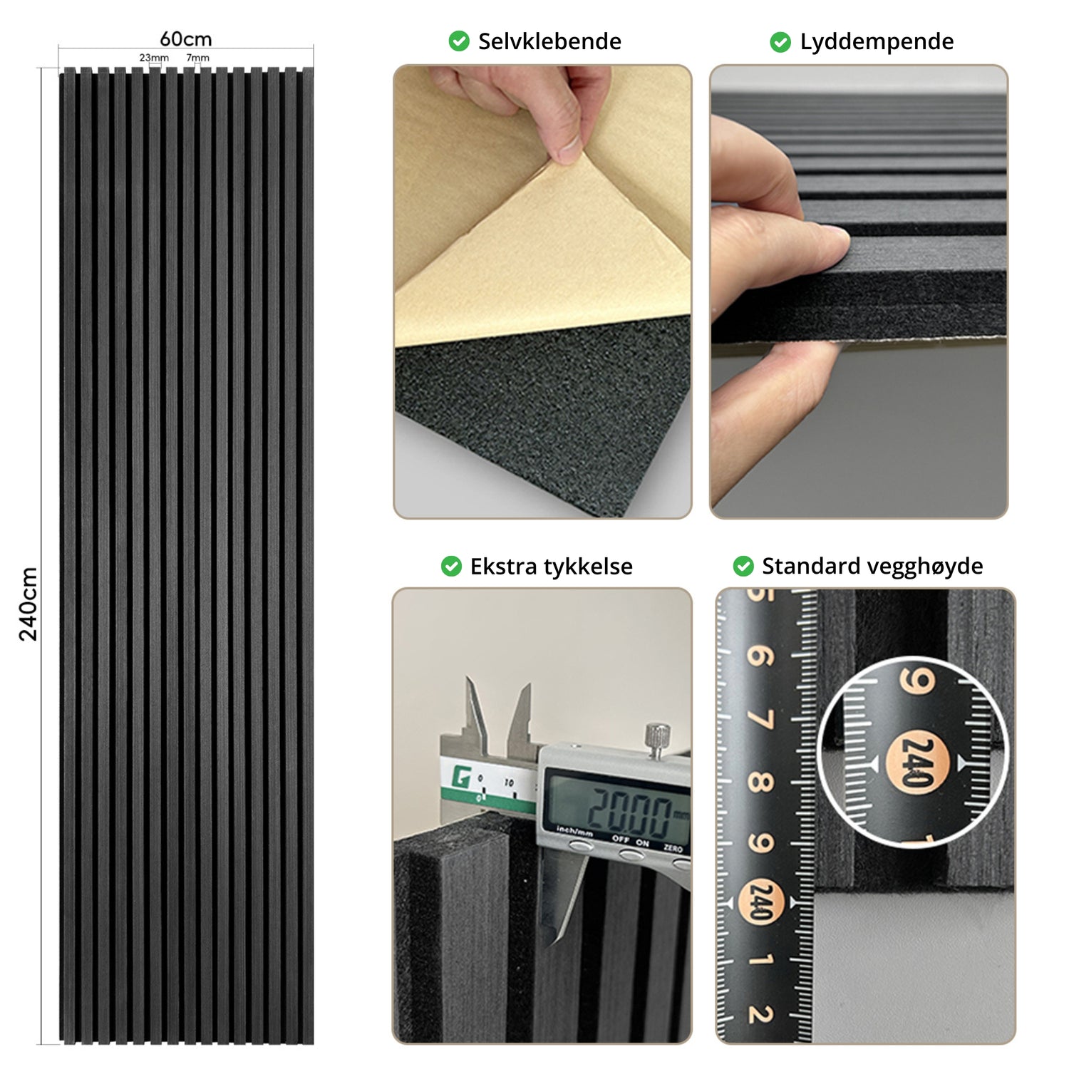 - Materiale: Finér + akustikkfilt + selvklebende bakside