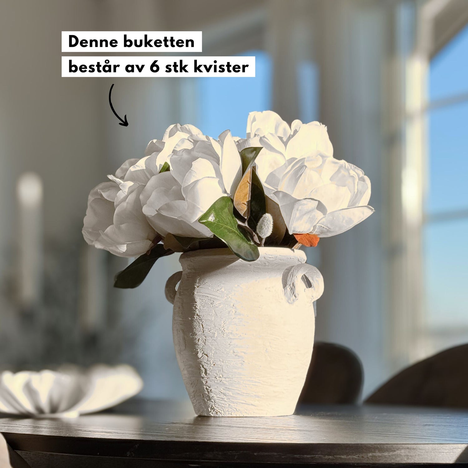 Pynt opp hjemme med Mr. Plants nydelige Magnolia blomst. Denne realistiske blomsten er perfekt for å skape en tidløs atmosfære av skjønnhet og eleganse. Sett den sammen med andre kvister og blomster får å skape en unik bukett eller ha den som dekor alene.