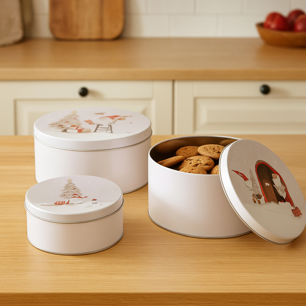 Disse sjarmerende oppbevaringsboksene med julemotiv er den perfekte løsningen for å lagre julebakst, små gaver eller dekorasjoner på en stilfull måte. Settet består av tre runde metallbokser i ulike størrelser, dekorert med koselige nisseillustrasjoner som gir en varm og nostalgisk julefølelse.