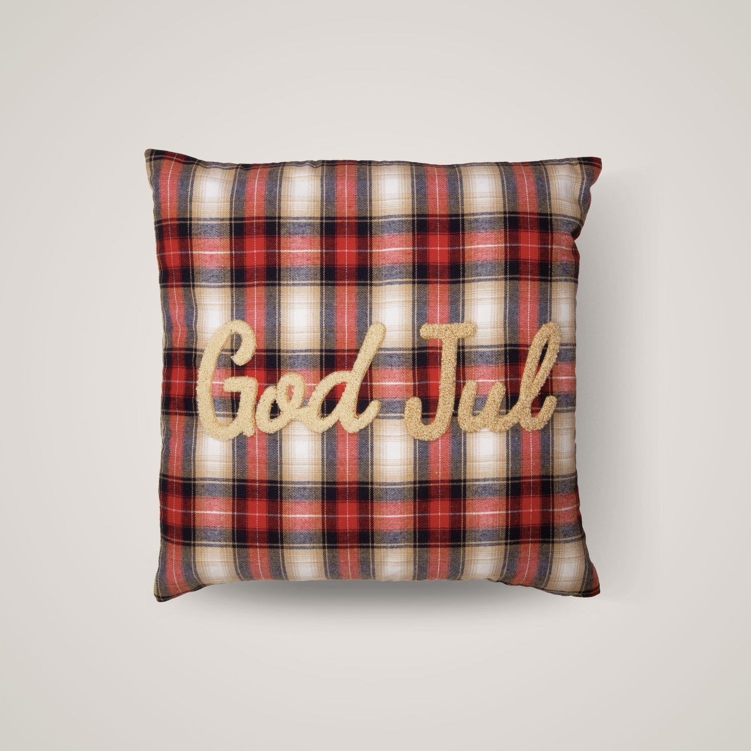 Putetrekk i rutet mønster med brodert "God Jul" gir hjemmet et varmt og koselig preg i julehøytiden. De klassiske røde, beige, hvite og sorte tonene passer perfekt inn i både moderne og nostalgiske interiørstiler.