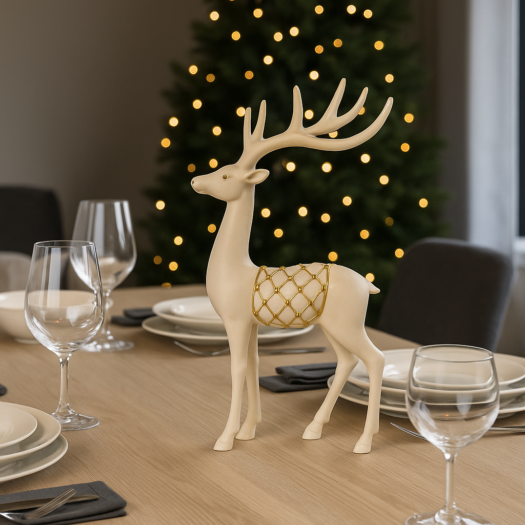 Dekorer hjemmet ditt med dette elegante stående reinsdyret i hvitt med gullrutet mønster. Figuren har et eksklusivt uttrykk, perfekt som julepynt på gulvet, i gangen, ved peisen eller som del av en dekorasjon på bordet.