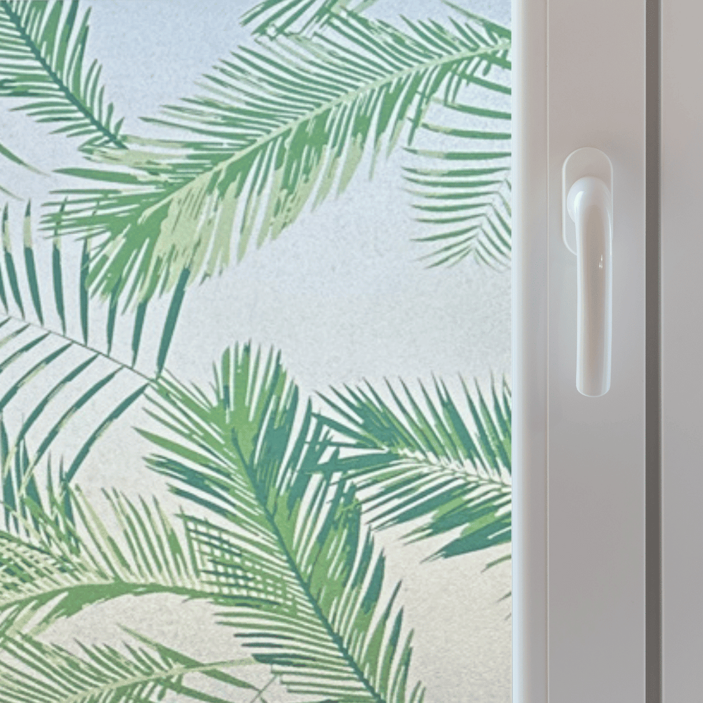 Static Premium Palme er statisk vindusfolie som skjermer all innsyn. Vindusfolien har motiv av grønne palmeblad. Folien monteres med kun hjelp av såpevann - ingen lim er nødvendig. Perfekt til å skjerme innsyn til bad, soverom, gang og stue.